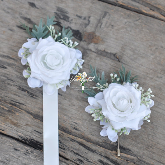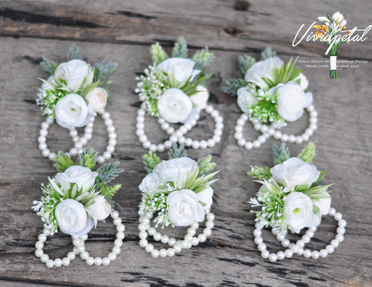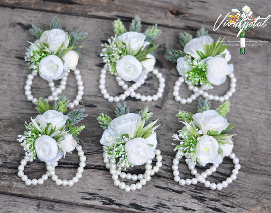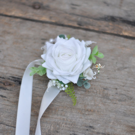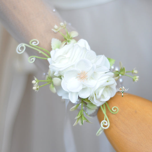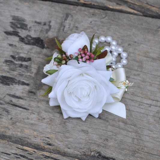 Wrist corsage/white rose corsage/mother corsage/bridesmaid corsage/flower girl corsage/wedding corsage/botanical pearl corsage/rustic corsage