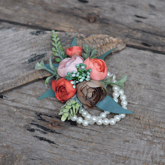 Bohemian theme wrist corsage/mother corsage/botanical pearl corsage/rustic wedding corsage/vintage orange corsage