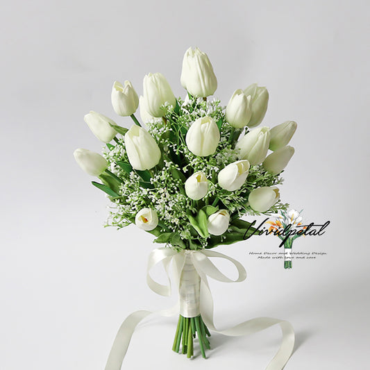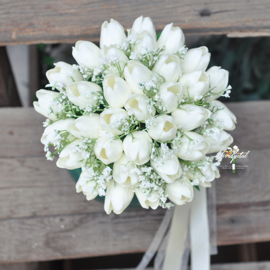 Round Real touch white ivory tulip baby's breath bouquet/bridal bouquet/bridesmaid bouquet/choose ribbon color bouquet