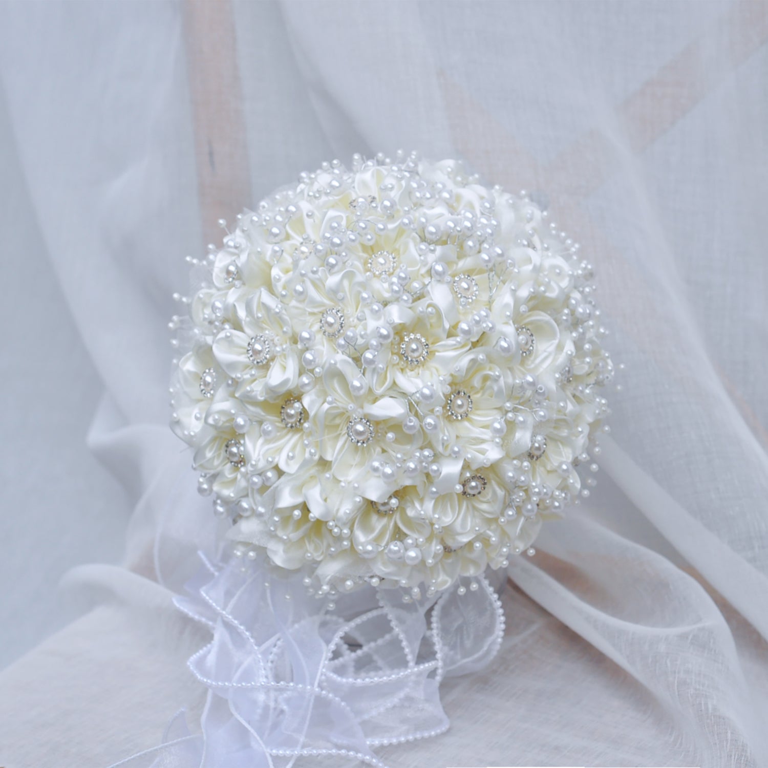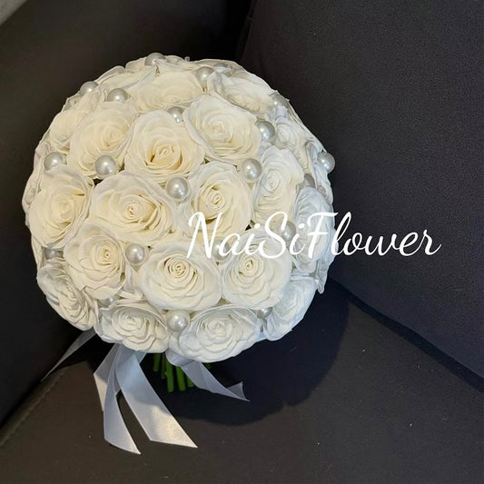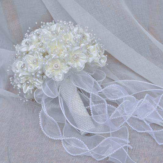 Ivory ribbon rose bouquet /Pearl bouquet/Elegant silk rose bouquet/Ivory white rose bouquet for beach wedding ,church wedding /shower and bridesmaids bouquet