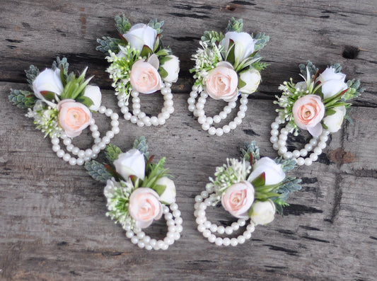 Wrist corsage/real touch light pink white rose corsage/choose ribbon colors corsage/mother corsage/pearl corsage/bridesmaids corsage/rustic wedding corsage /boutonnieres/pin corsage