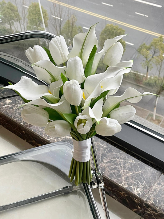 Real touch Warm hearted tulip calla lily bouquet for bath/office/home decoration, best as a centerpiece and gifts for her