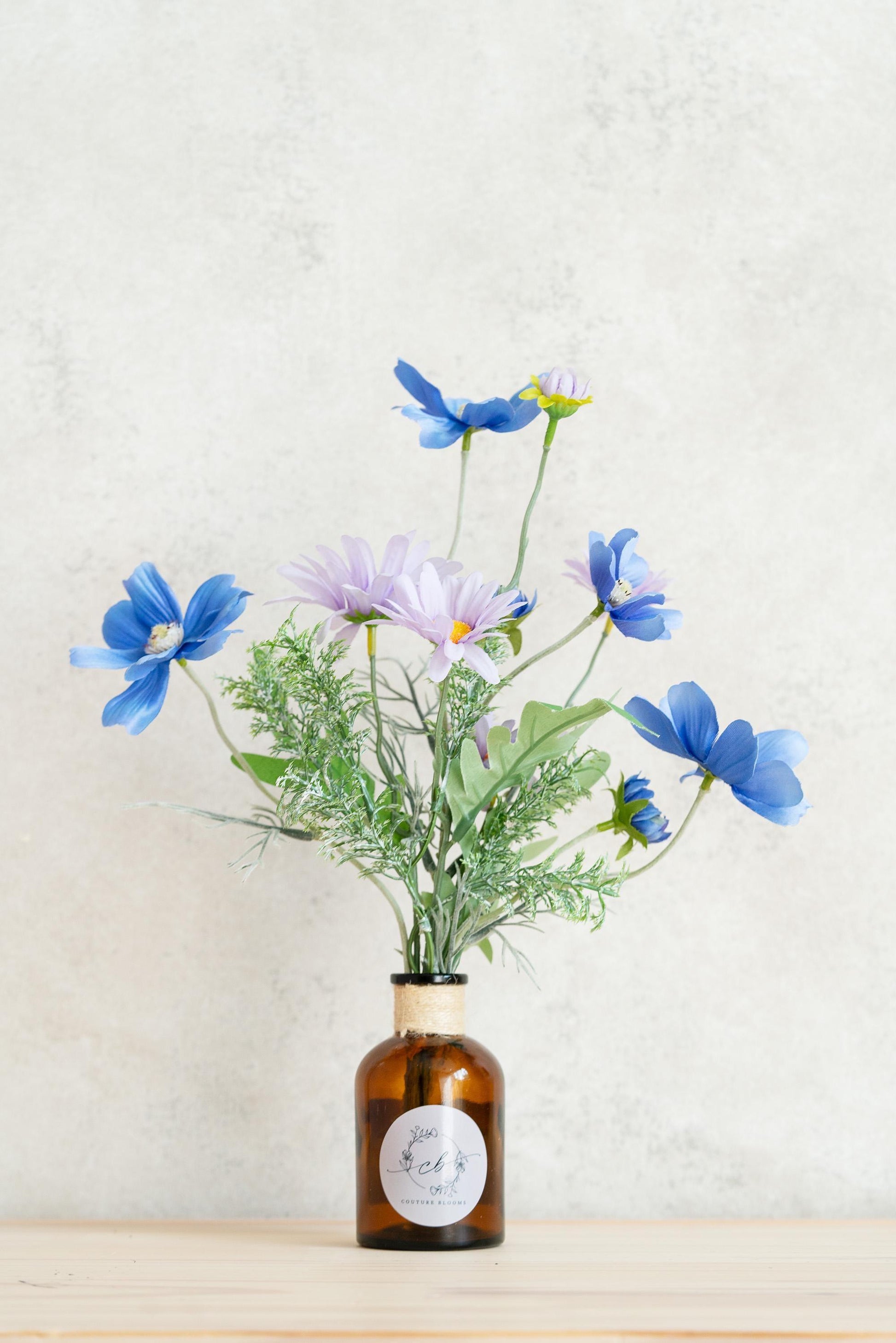 ❤ This silk mini bouquet features artificial mini daisies and cosmos blooms in soft lavender and vivid blue.