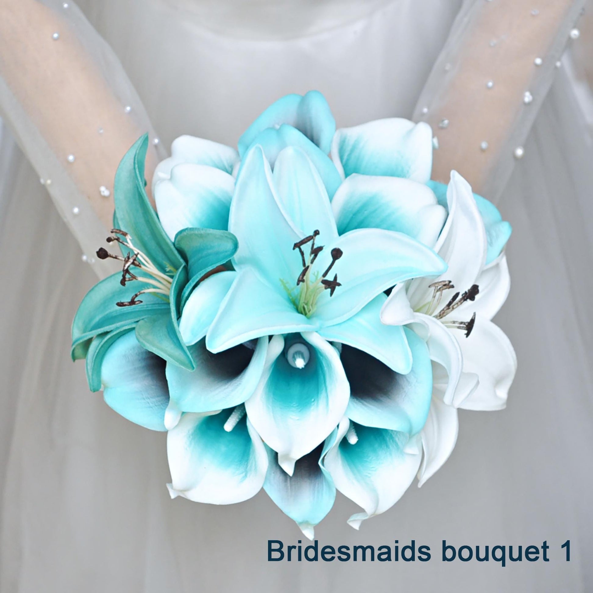Cascade Tiffany Calla Lily Bridal Bouquet, Tiger Lily Bridesmaid Bouquet, Spa Turquoise Lily Bouquet, Rustic White Beach Wedding Bouquet