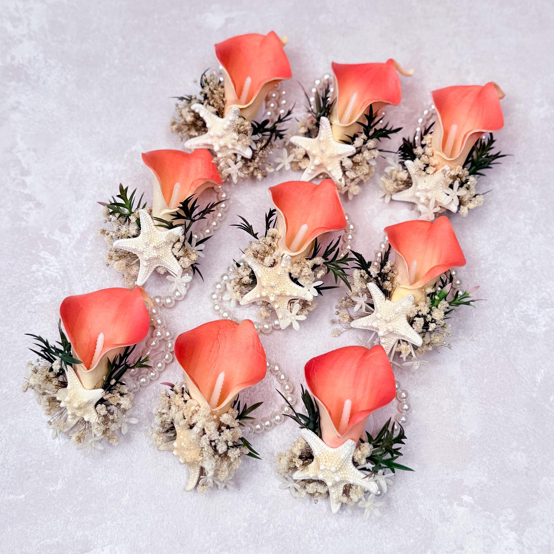 Coral Calla Lily Pearl Bracelet For Beach Wedding - Real Touch Wrist Corsage For Prom, Bride To Be Gift, Starfish Groom Boutonniere