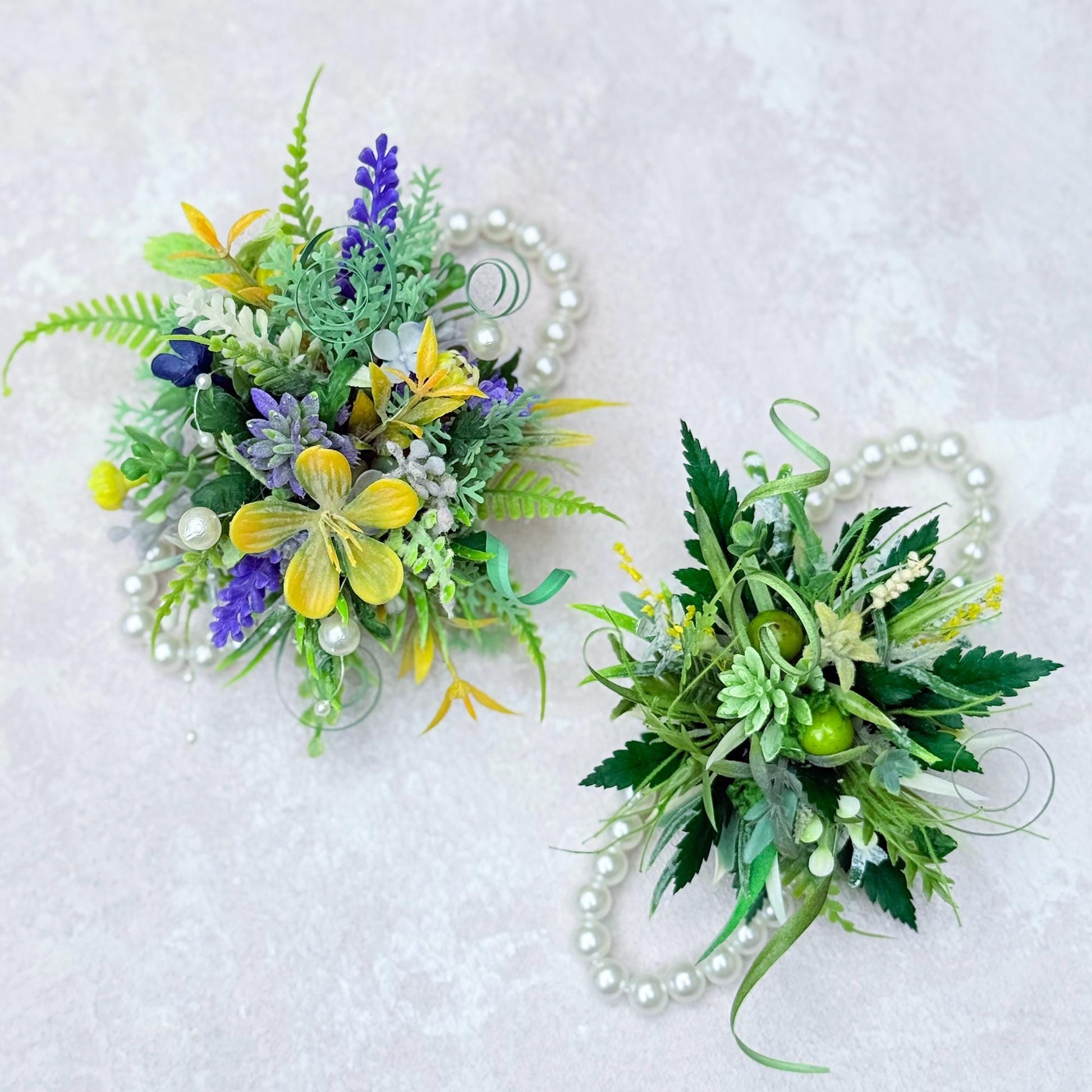 ❤ This rustic dark green corsages are made with dried-look wildflowers, faux pearl bracelet, and soft foliage in purple tones.