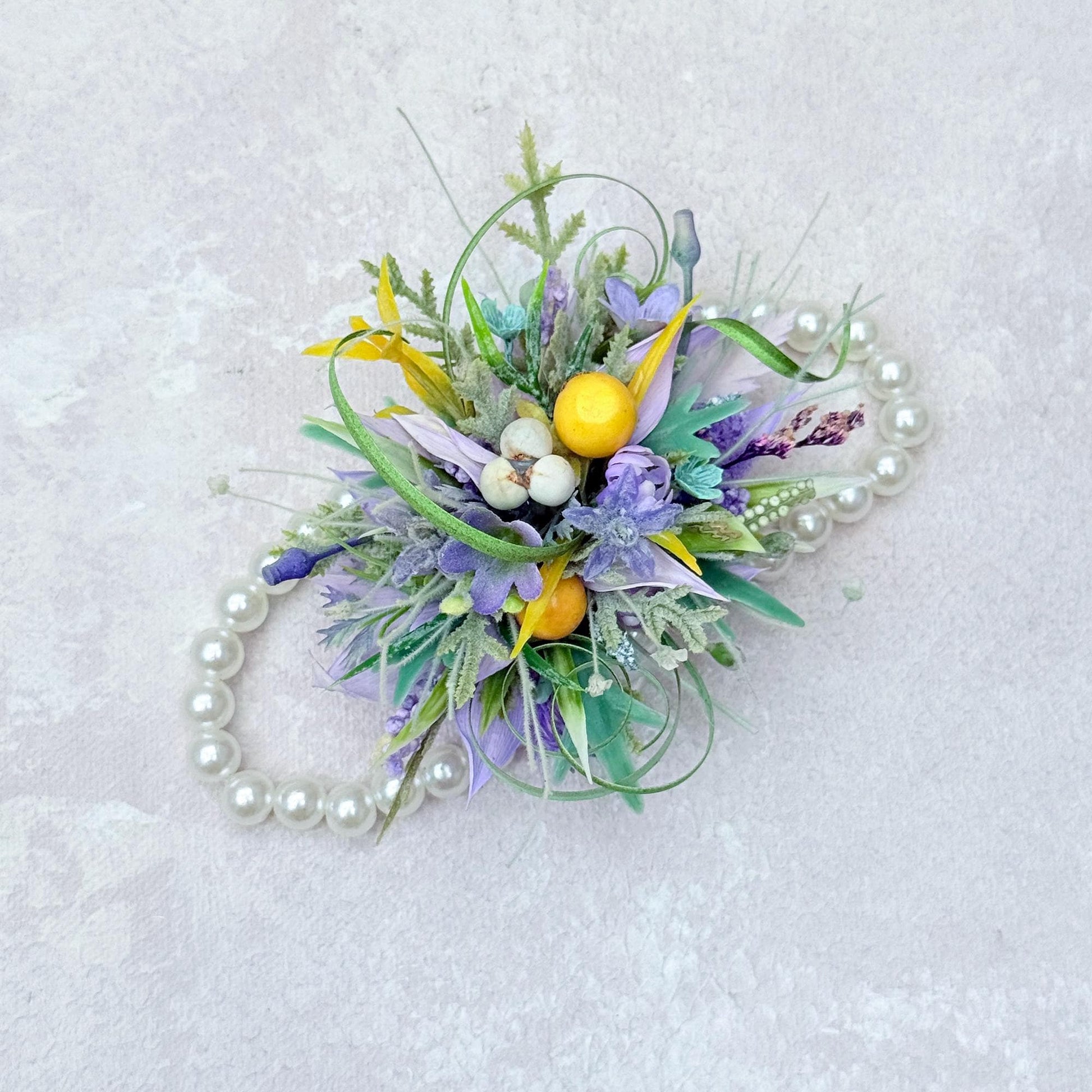 ❤ This rustic lavender corsage and boutonniere are made with dried-look wildflowers, faux pearl bracelet, and soft foliage in purple tones.