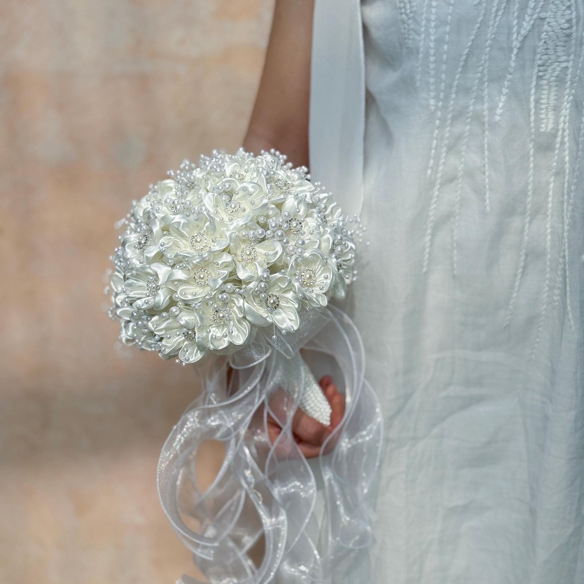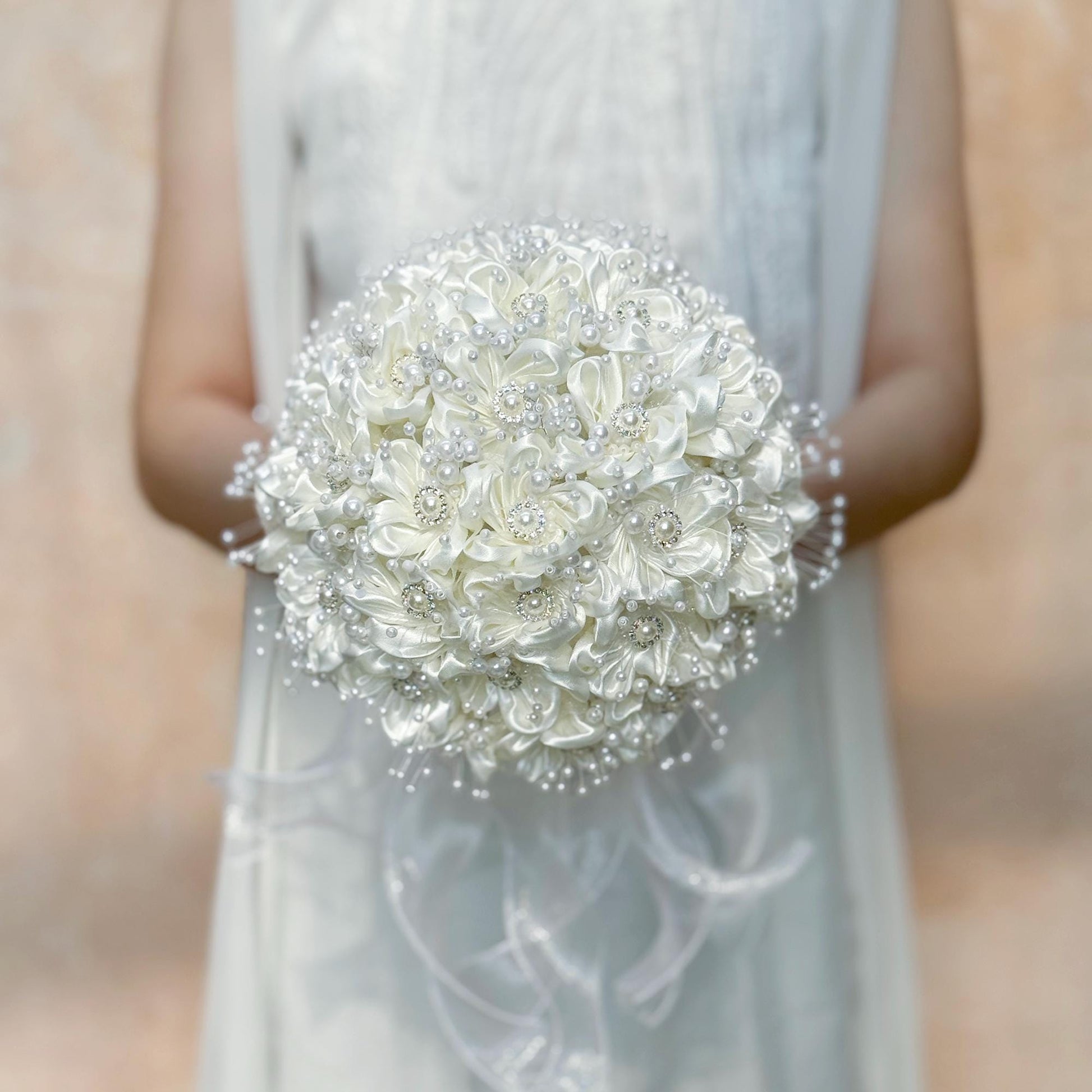 Elegant Pearl Ivory Ribbon Rose Bouquet, Personalized Wedding Rose Flowers, Bridesmaid Gift Idea, Wedding Engagement Gifts Ideas