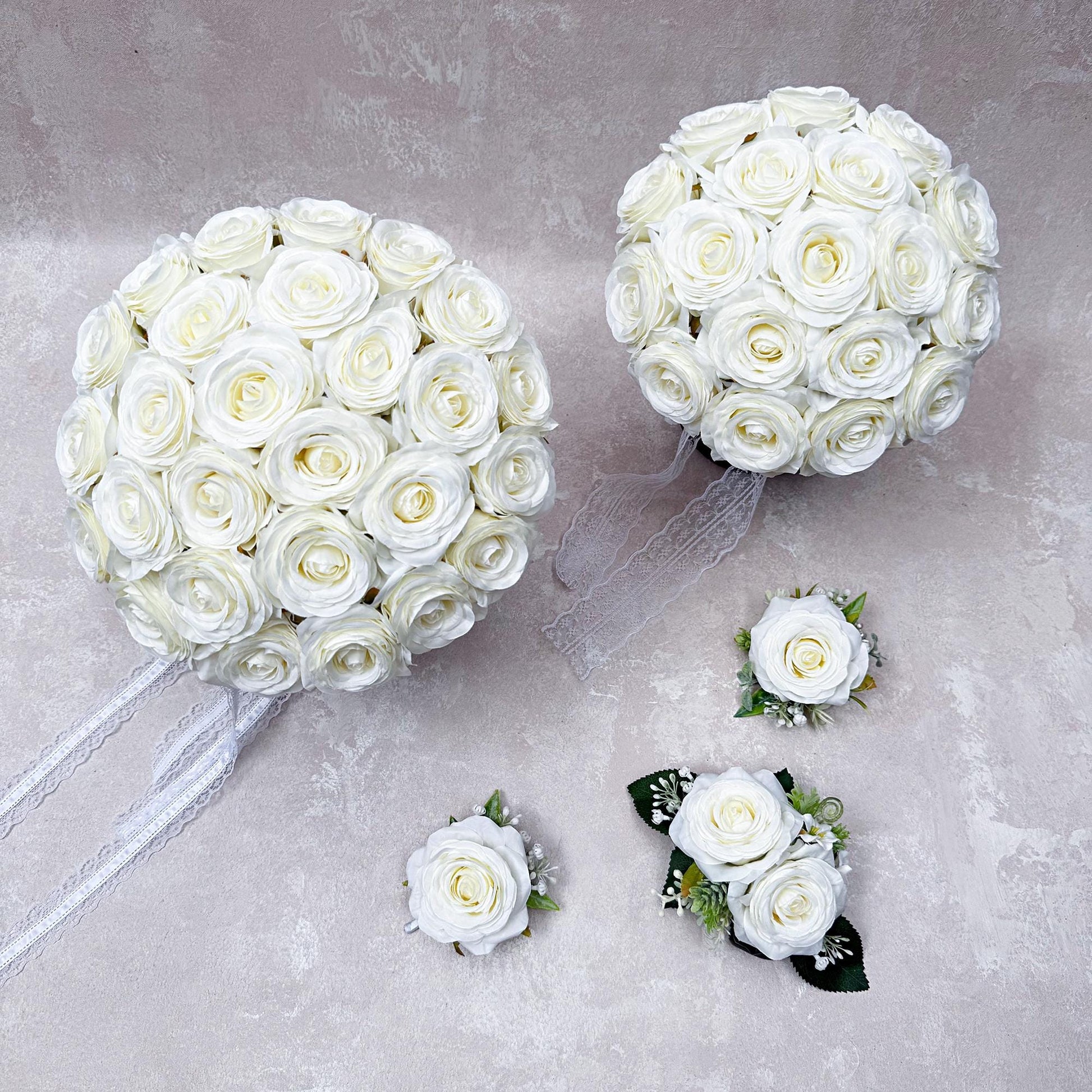 Elegant Round Ivory Rose Bouquet – Custom Bridal Party Accessories, Bridesmaid Bouquet Gift, Mother Corsage, Boutonniere, Cake Topper