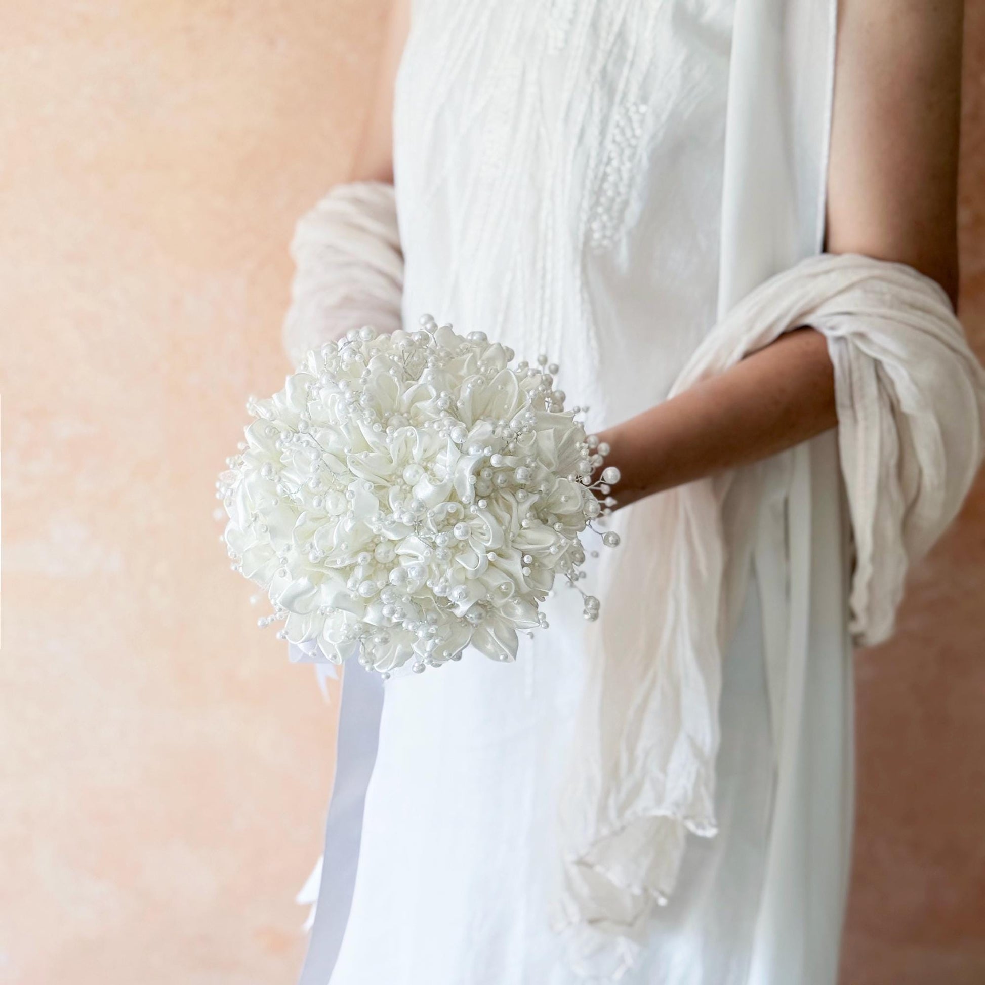 Fantastic Ivory Pearl Ribbon Rose Prom Bouquet, Personalized Pearl Rose bouquet gift for her wedding Bridal, Bride shower, flower girl gift