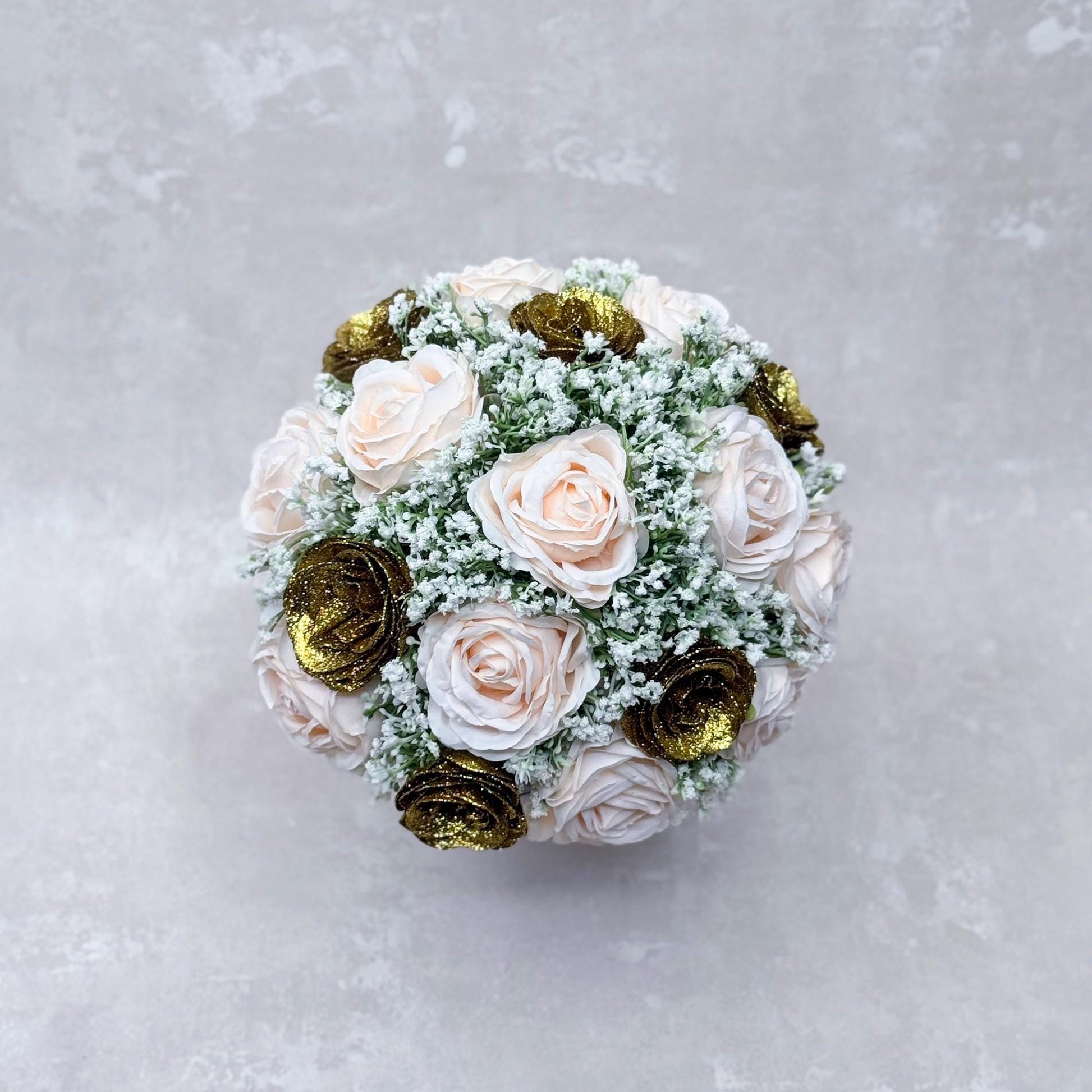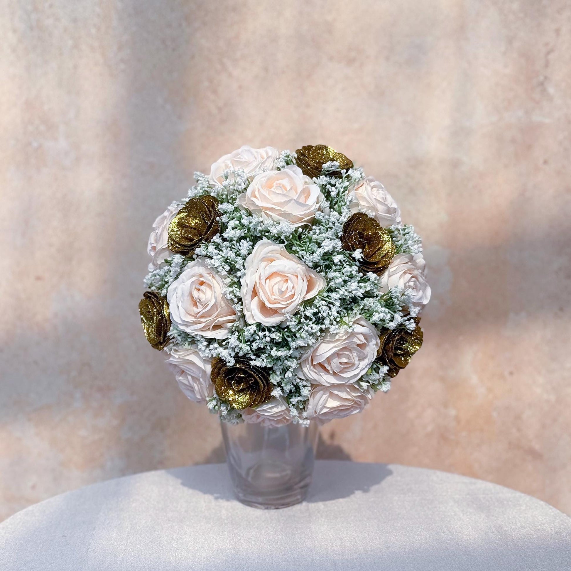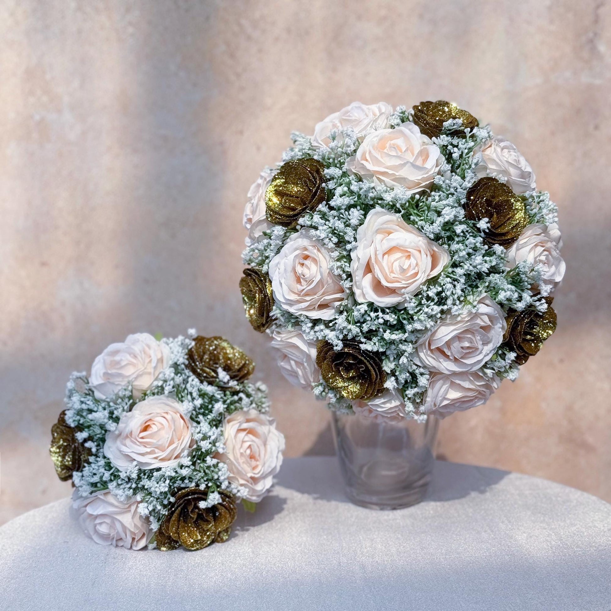 Each bouquet is carefully arranged using high-quality silk flowers with shimmering accents and airy baby’s breath. The gold sparkle and soft pink tones create a look that is both glamorous and timeless — just like her.