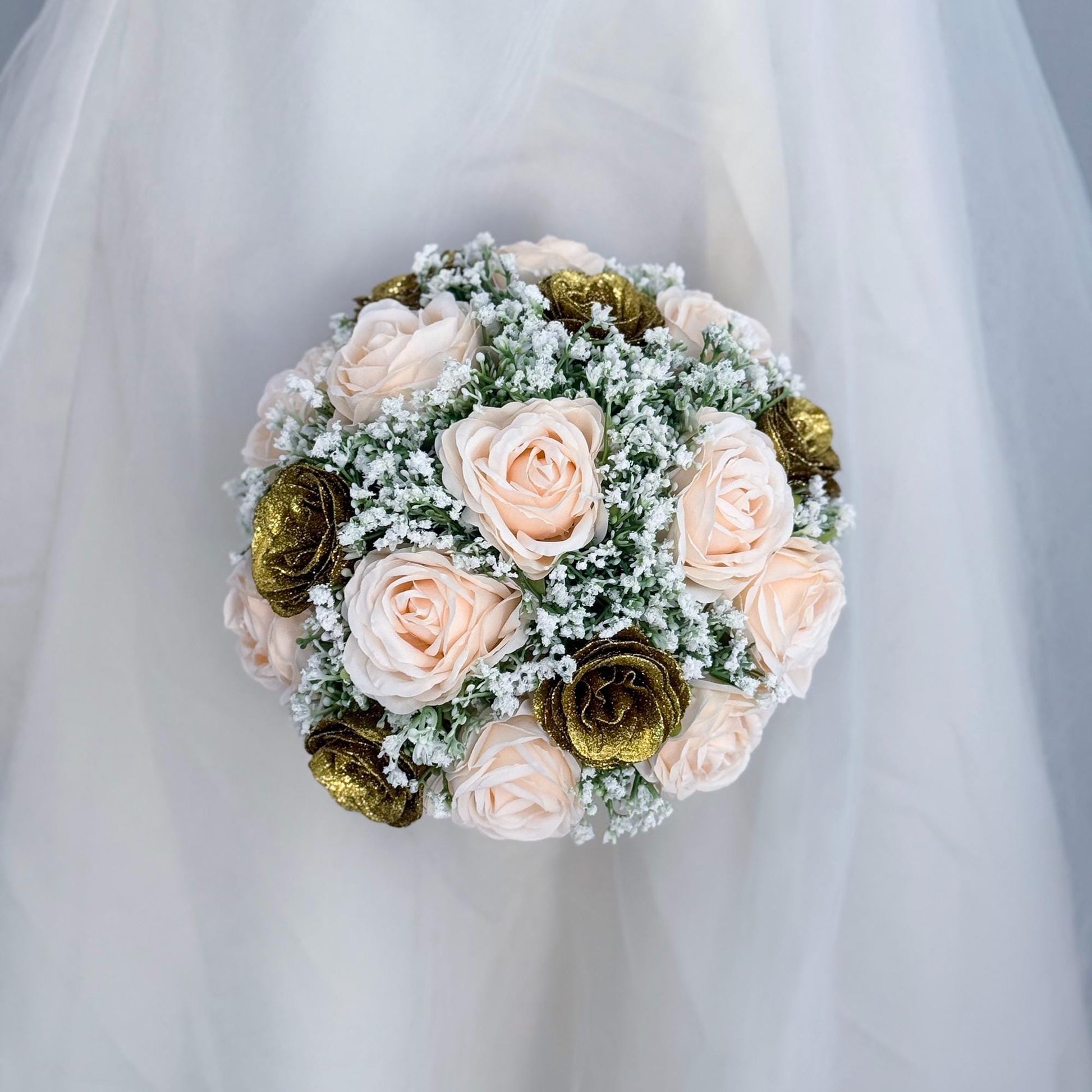 Glitter Champagne Pink Bridal Bouquet with baby's breath – Wedding Bouquet, Quinceanera, 15th Birthday, Coming of Age Ceremony, Gift for Her
