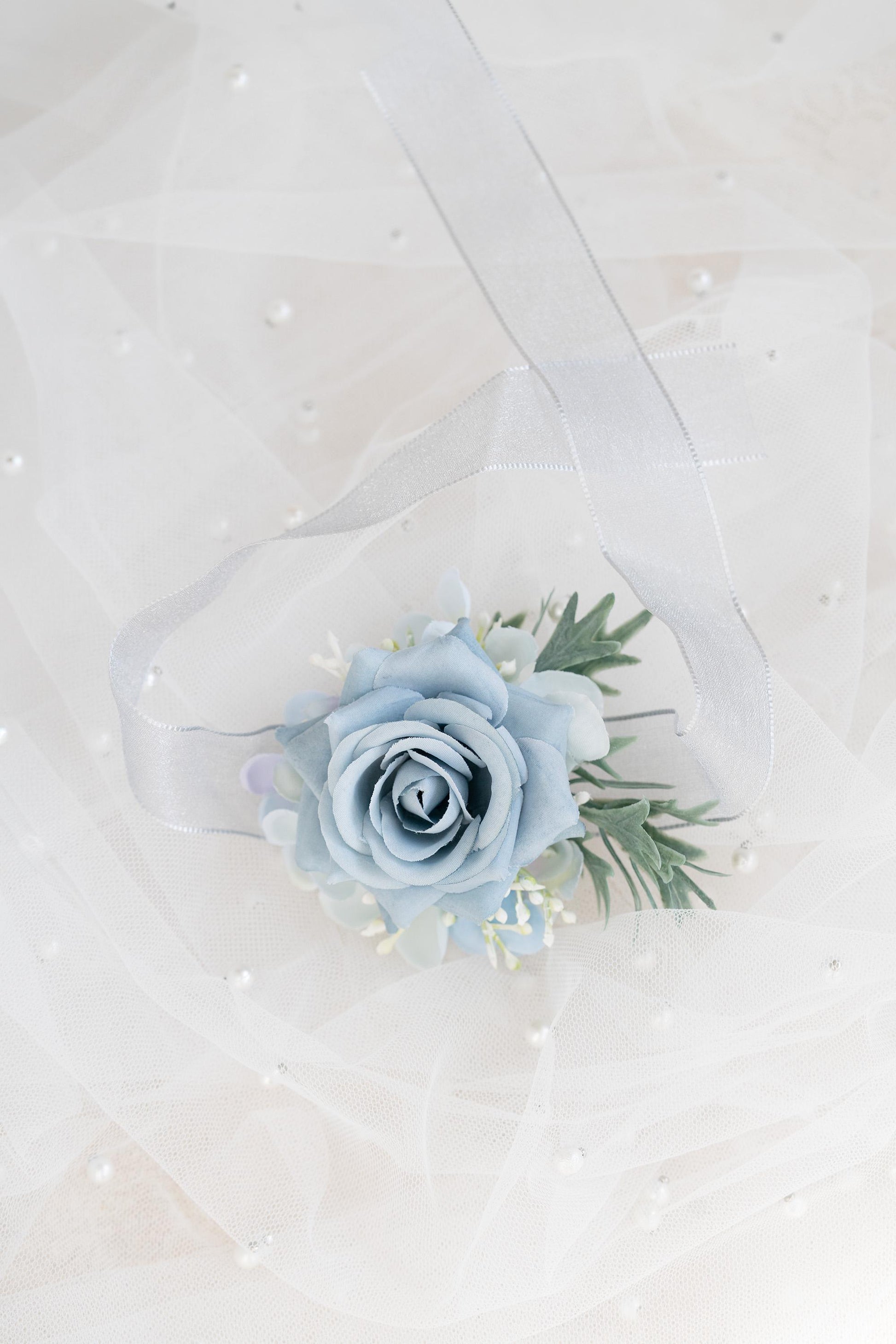Gray Blue Rose Wrist Corsage for Boho Wedding, Flower Girl Wristlet, Teal Gray Prom Corsage, Groom Boutonniere, Bridesmaid Corsage Gift