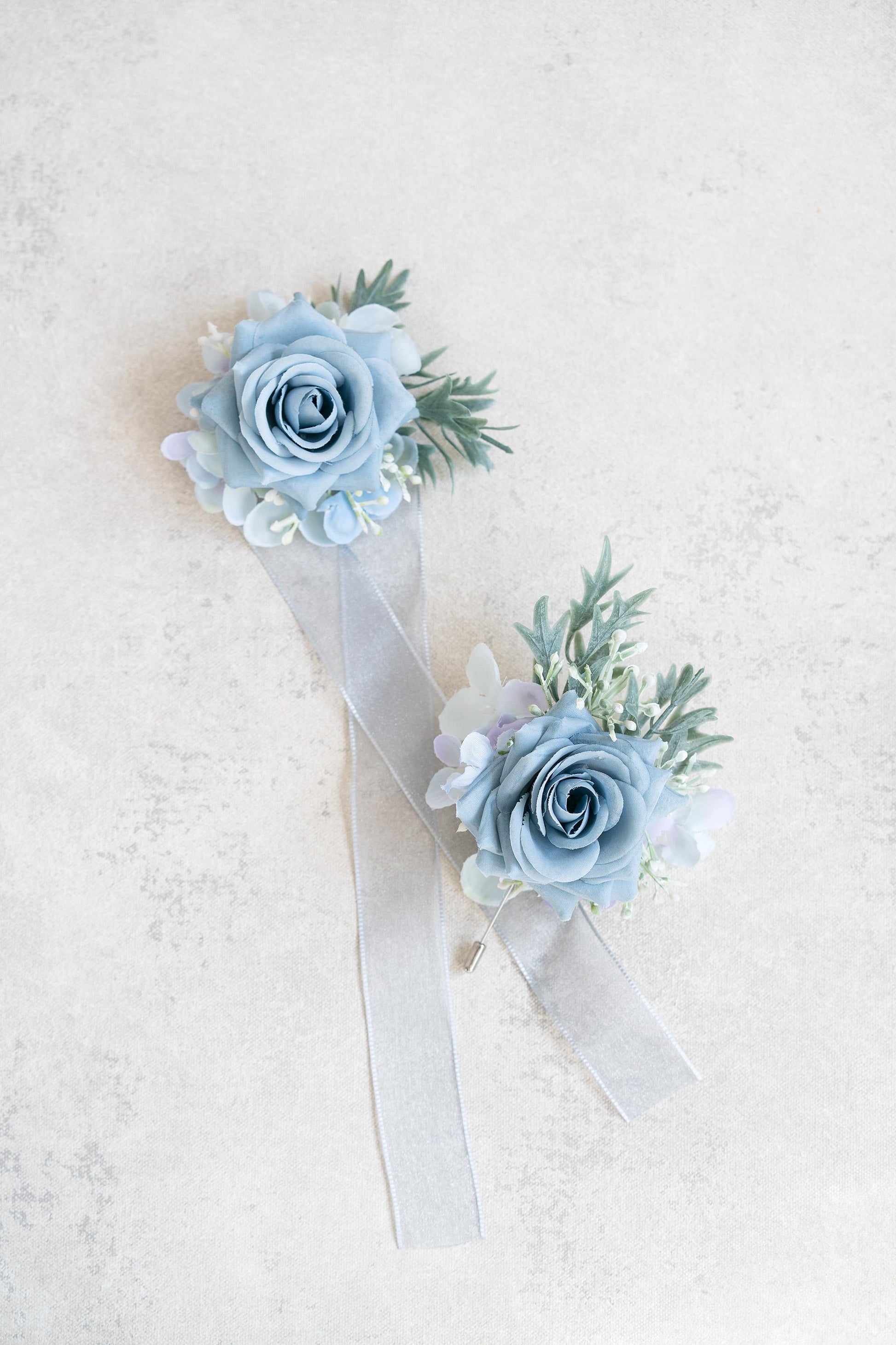 ❤This gray blue corsage is made with silk rose flowers and fern. The price includes one corsage or one boutonniere.