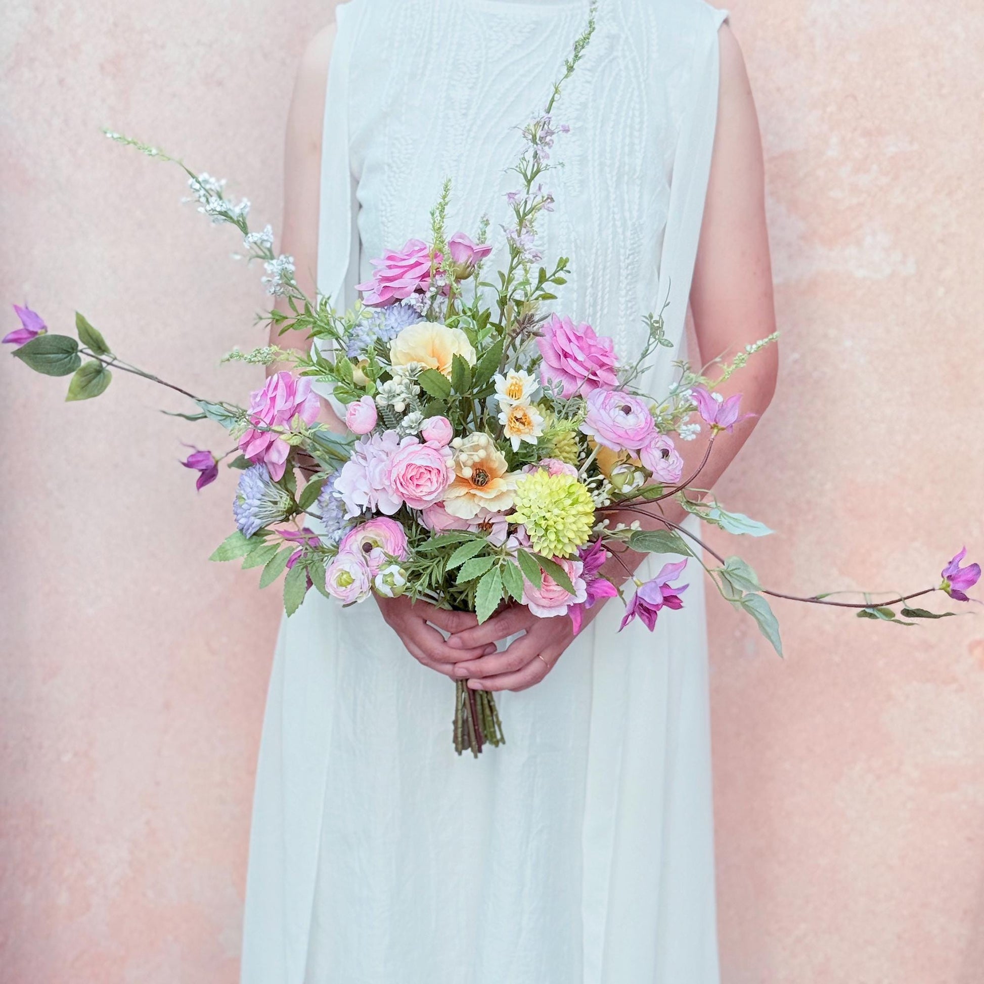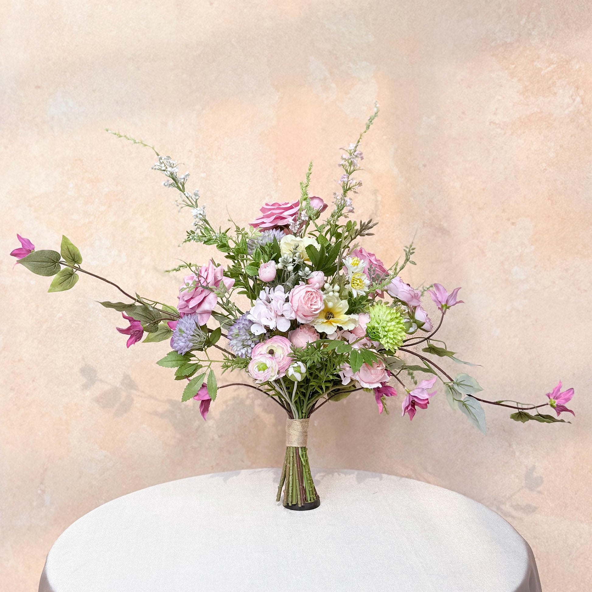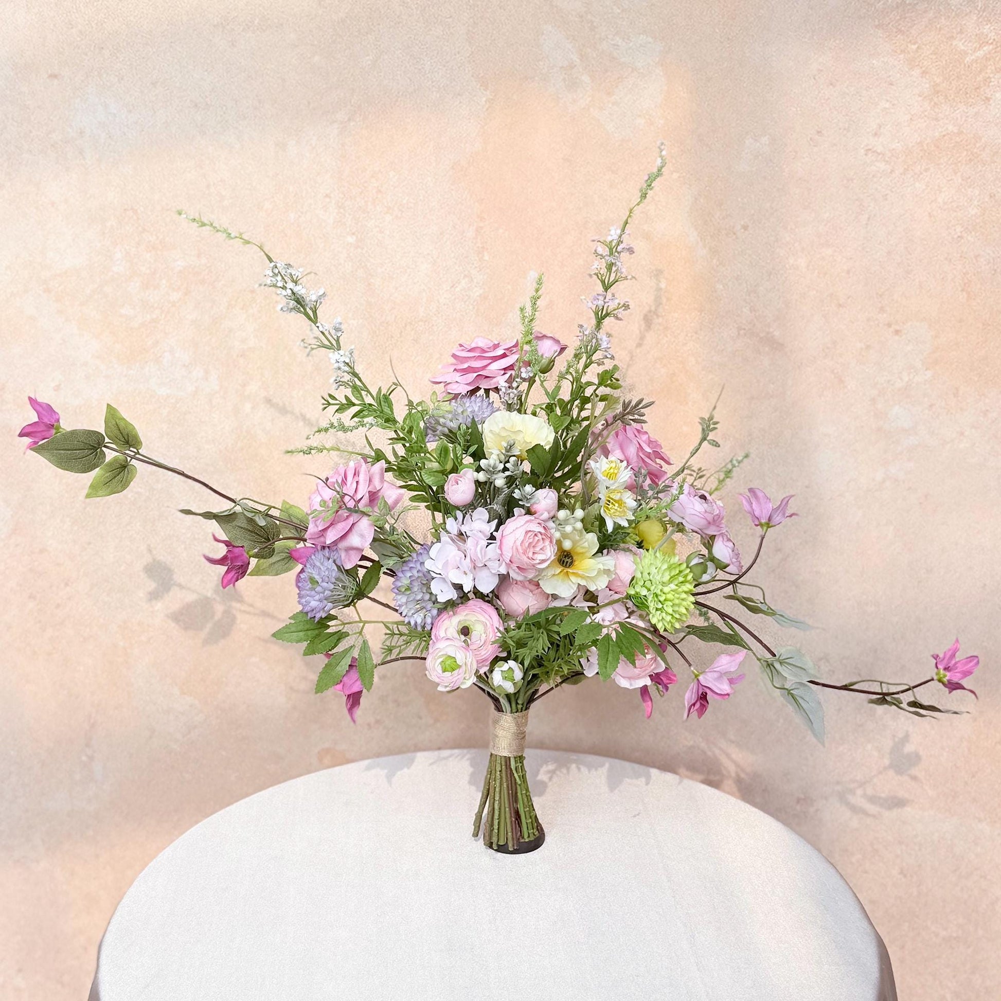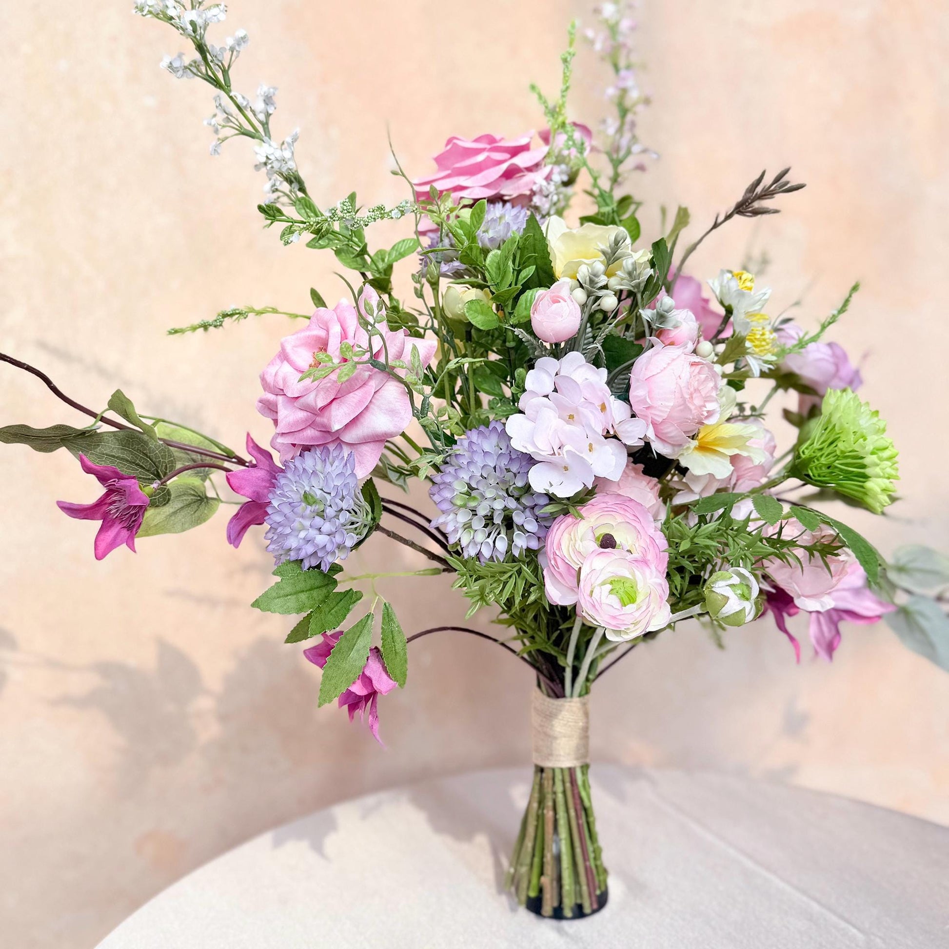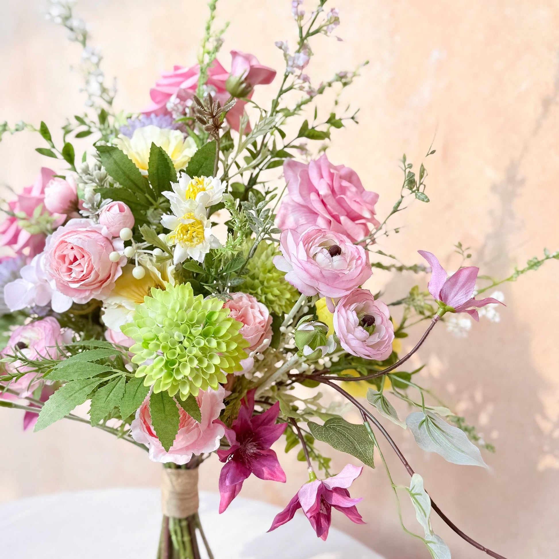 A harmonious palette of pinks, purples, whites, and fresh greens creates a whimsical, airy elegance—perfect for garden or beach weddings, romantic photoshoots, or sophisticated home styling. The stems are hand-tied with natural jute twine for a rustic finish. Ribbon color can be customized, and we offer complimentary ribbon printing to make your bouquet uniquely yours.