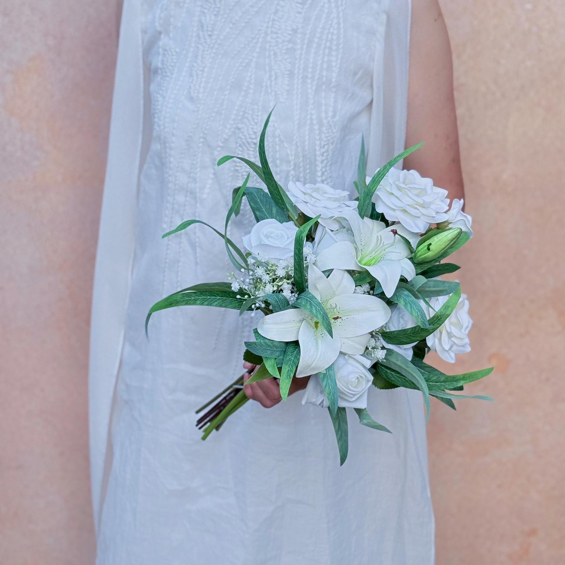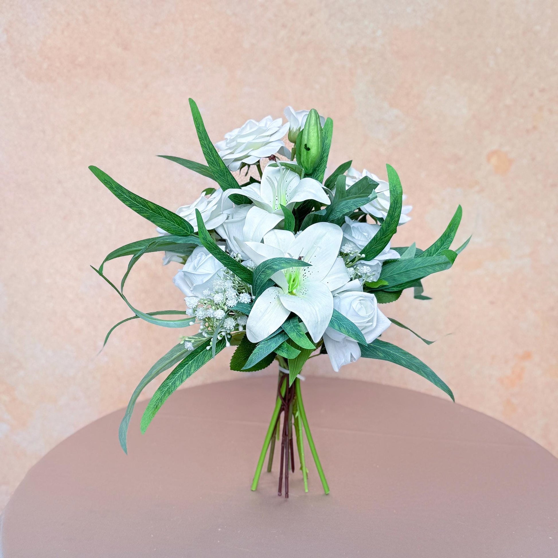 Each bouquet is hand-assembled with high-quality silk lilies and roses that closely mimic the look and feel of fresh blooms.