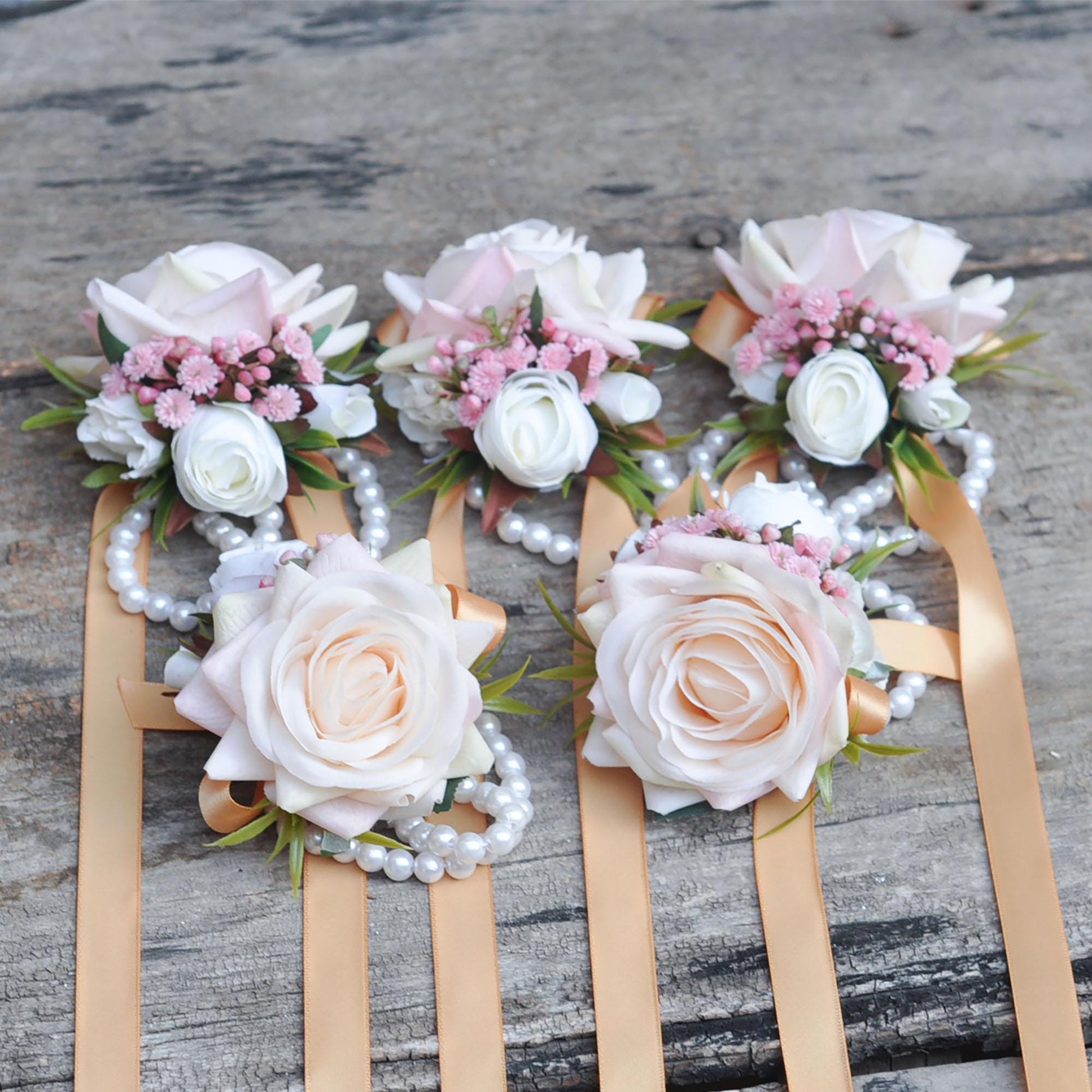 Personalized Champagne Pink Rose Pearl Bracelet Wrist Corsage, Bridesmaid Gift for Her, Mom, Bridal Accessories, Best Man Boutonniere Prom