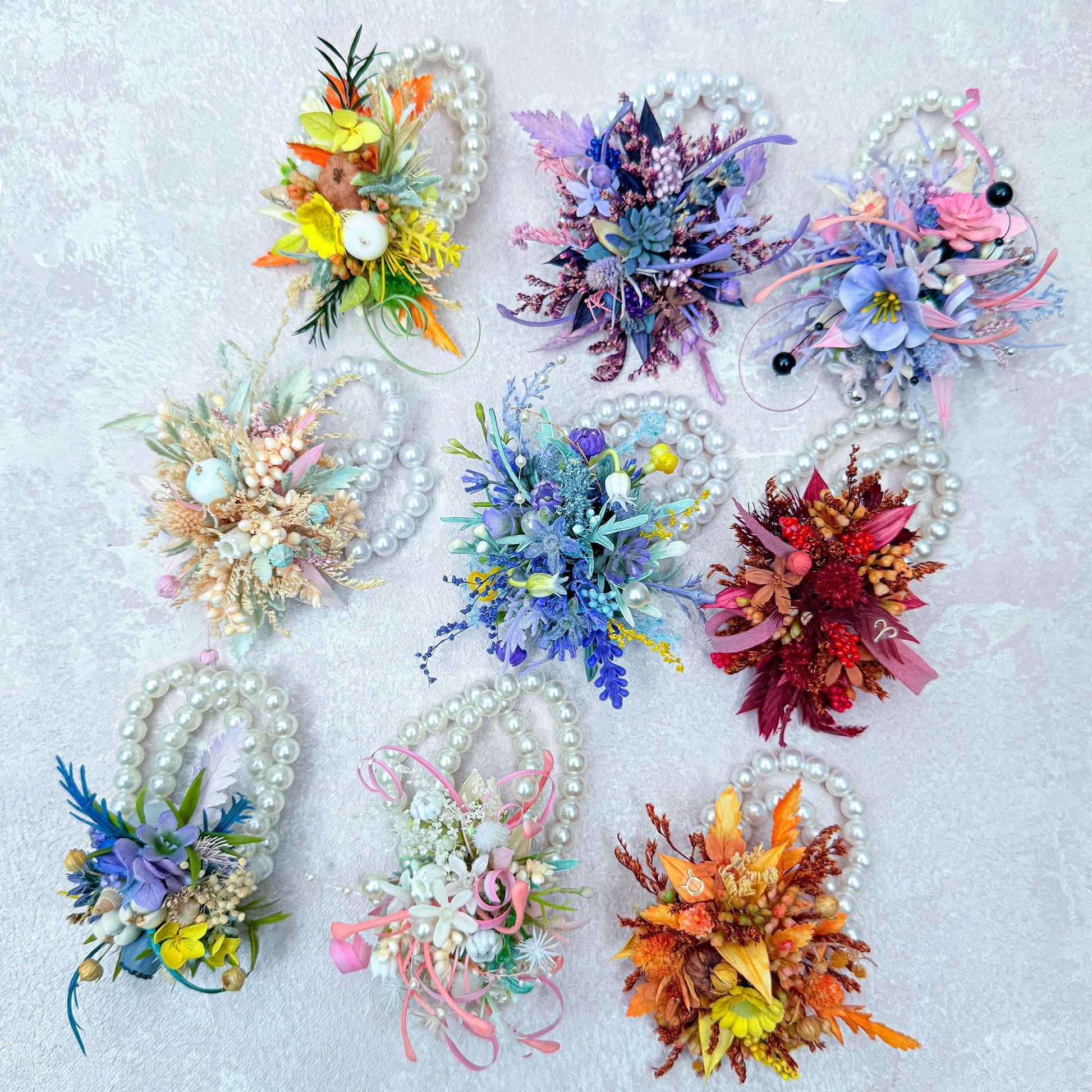 ❤ A graceful Zodiac-inspired wrist corsage collection handcrafted with real dried forever bracken fern, baby pumpkin, Brazilian starflower, and Australian eryngo, e.t.c. Thoughtfully paired with silk sunflower, artificial baby’s breath, berries, and delicate filler florals and foliage. Designed to look astonishingly lifelike, it exudes an air of pastoral elegance and timeless charm.