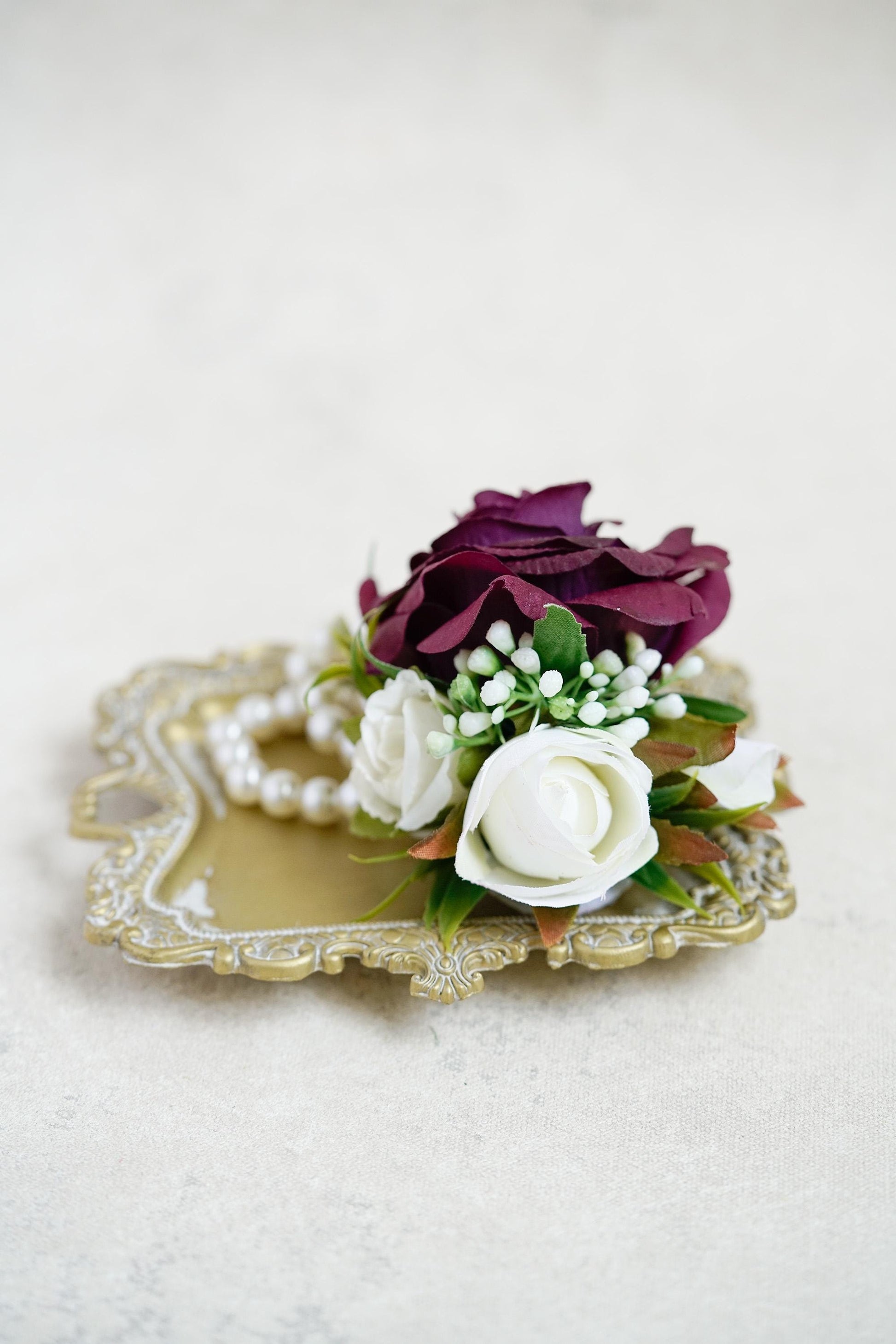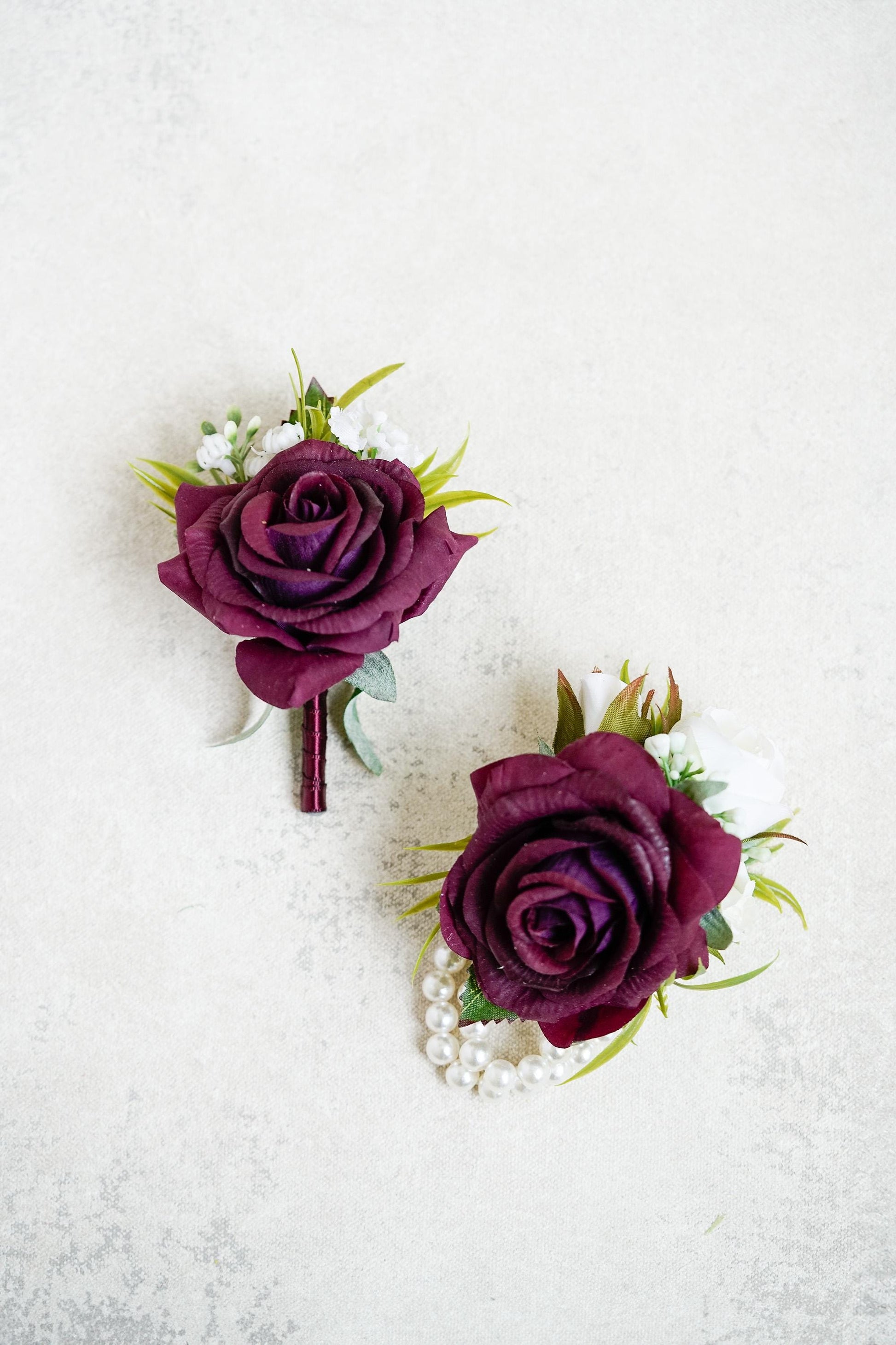 ❤ This wine-red wrist corsage or boutonniere features real touch burgundy rose blooms set on a pearl bracelet or pin-back base.