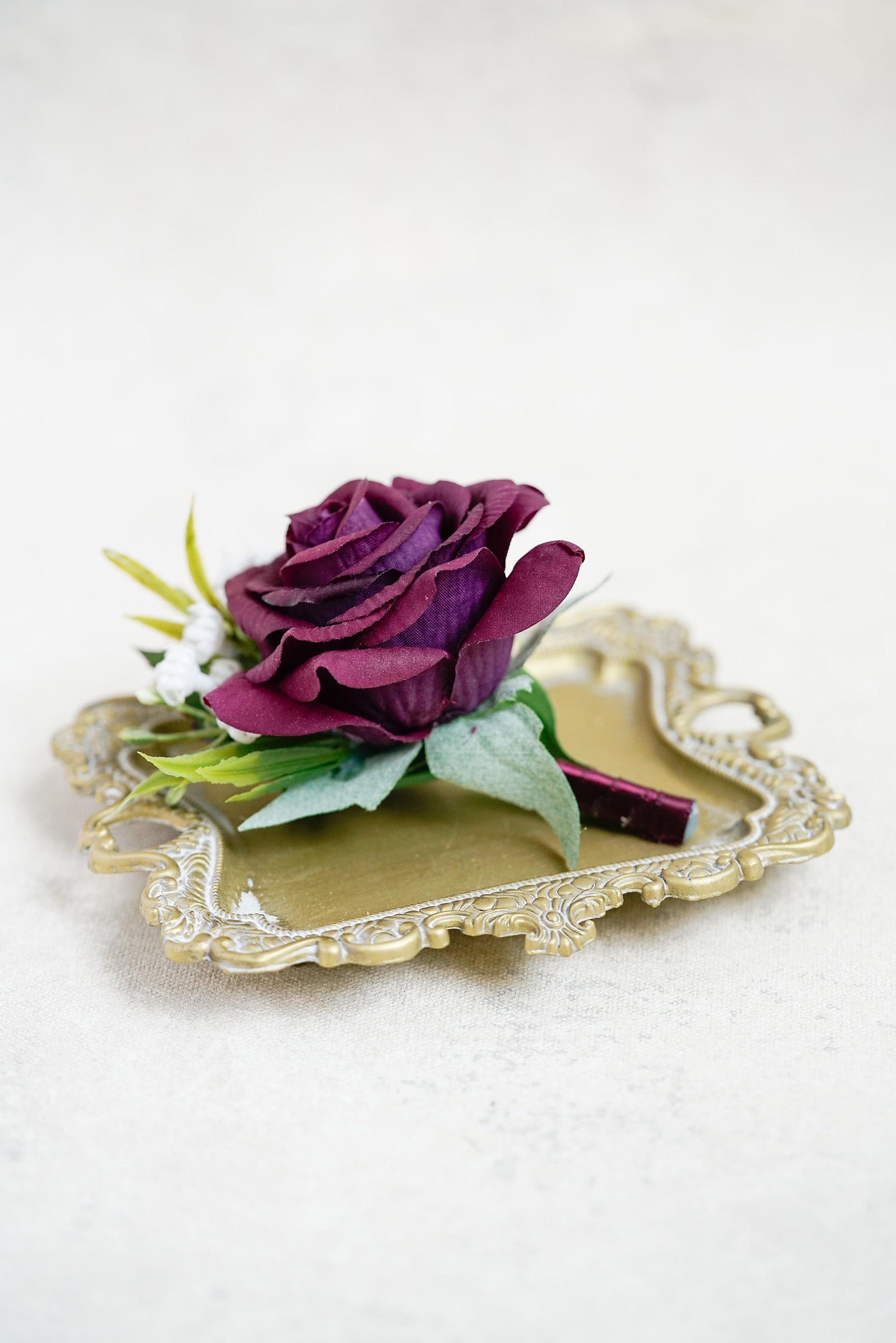 This lifelike burgundy rose corsage is crafted to closely mimic the look and feel of fresh blooms.