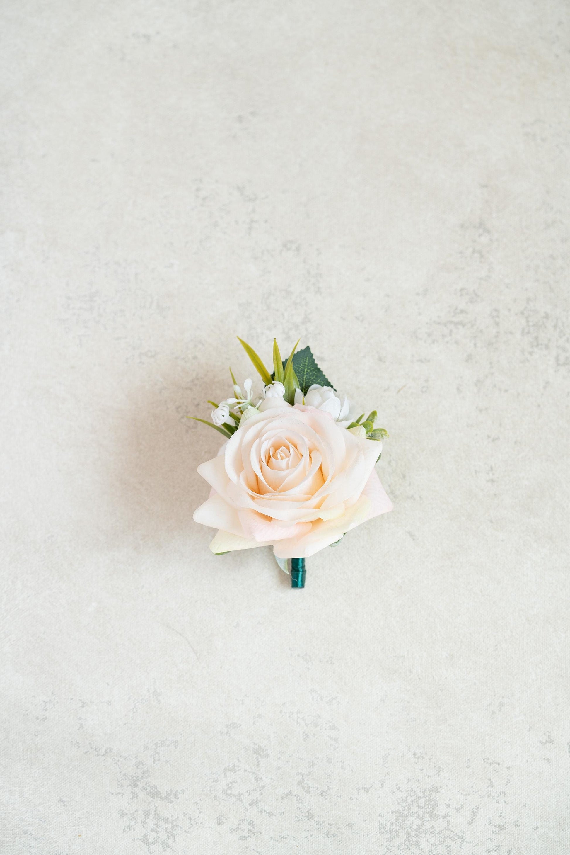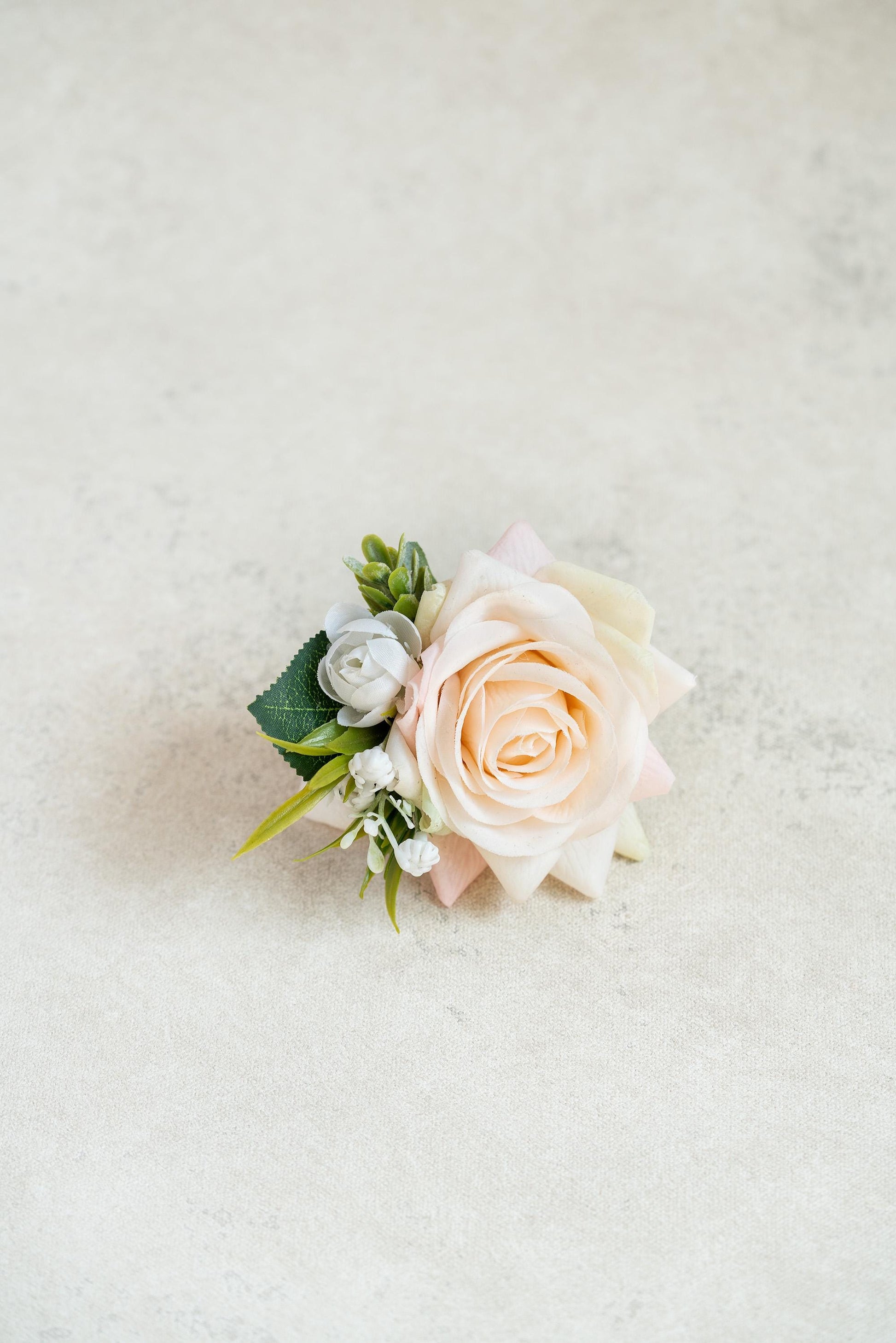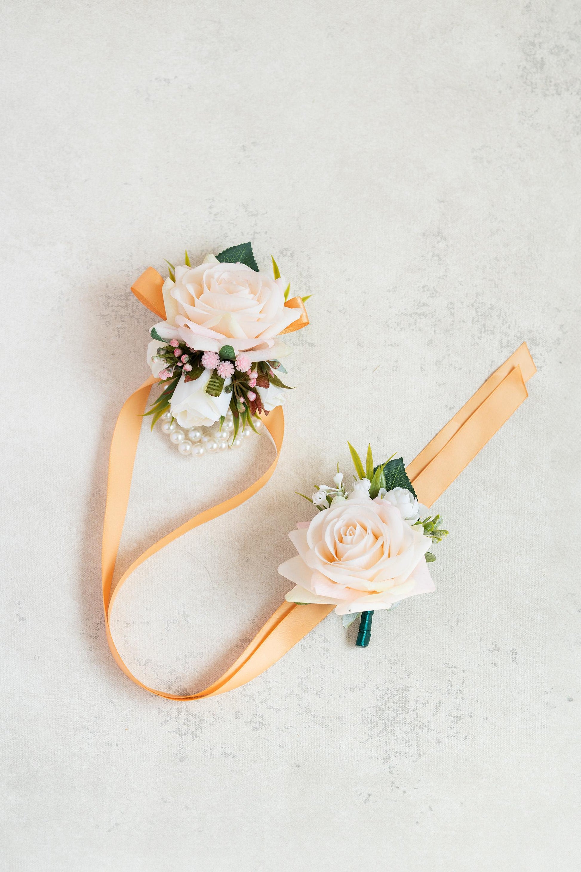 ❤This real touch champagne pink rose corsage is made with real touch rose flowers and rose bud, decorated with a hint of berries and baby's breath. The price includes one corsage or one boutonniere.