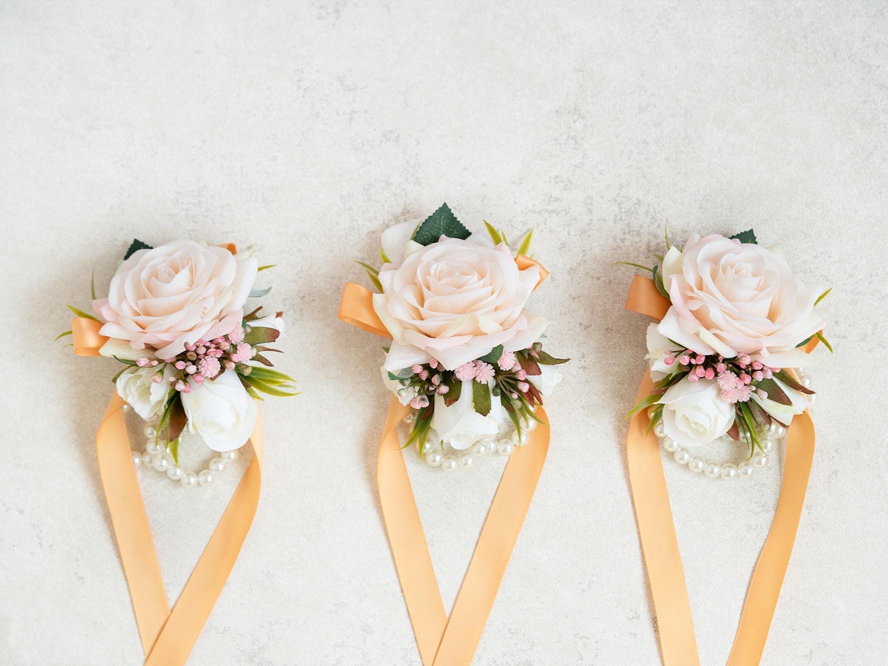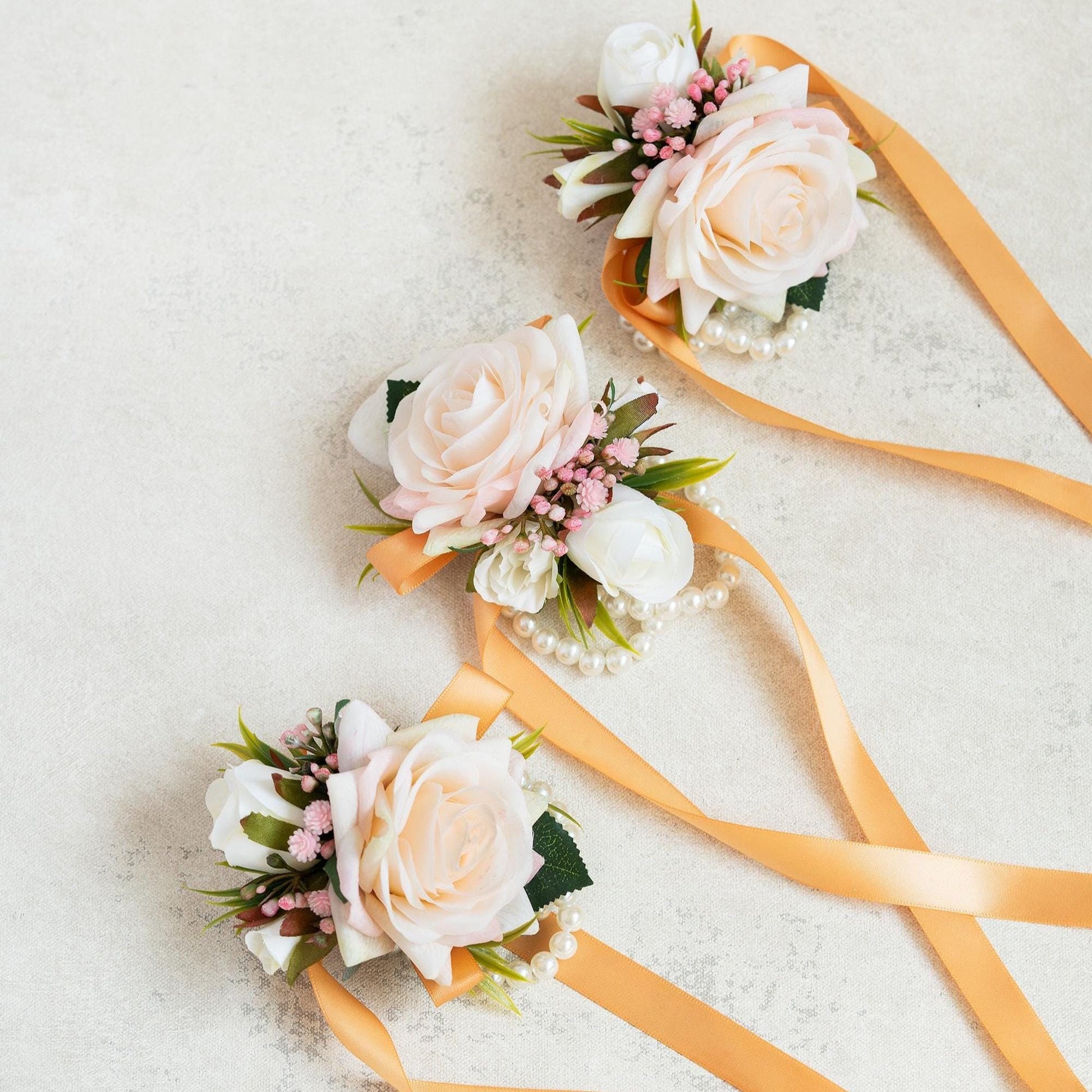 Real Touch Champagne Pink Pearl Bracelet Wrist Corsage Gift for Wedding, Flower Girl, Bridesmaid,Bridal Accessories Gift, Prom Boutonniere