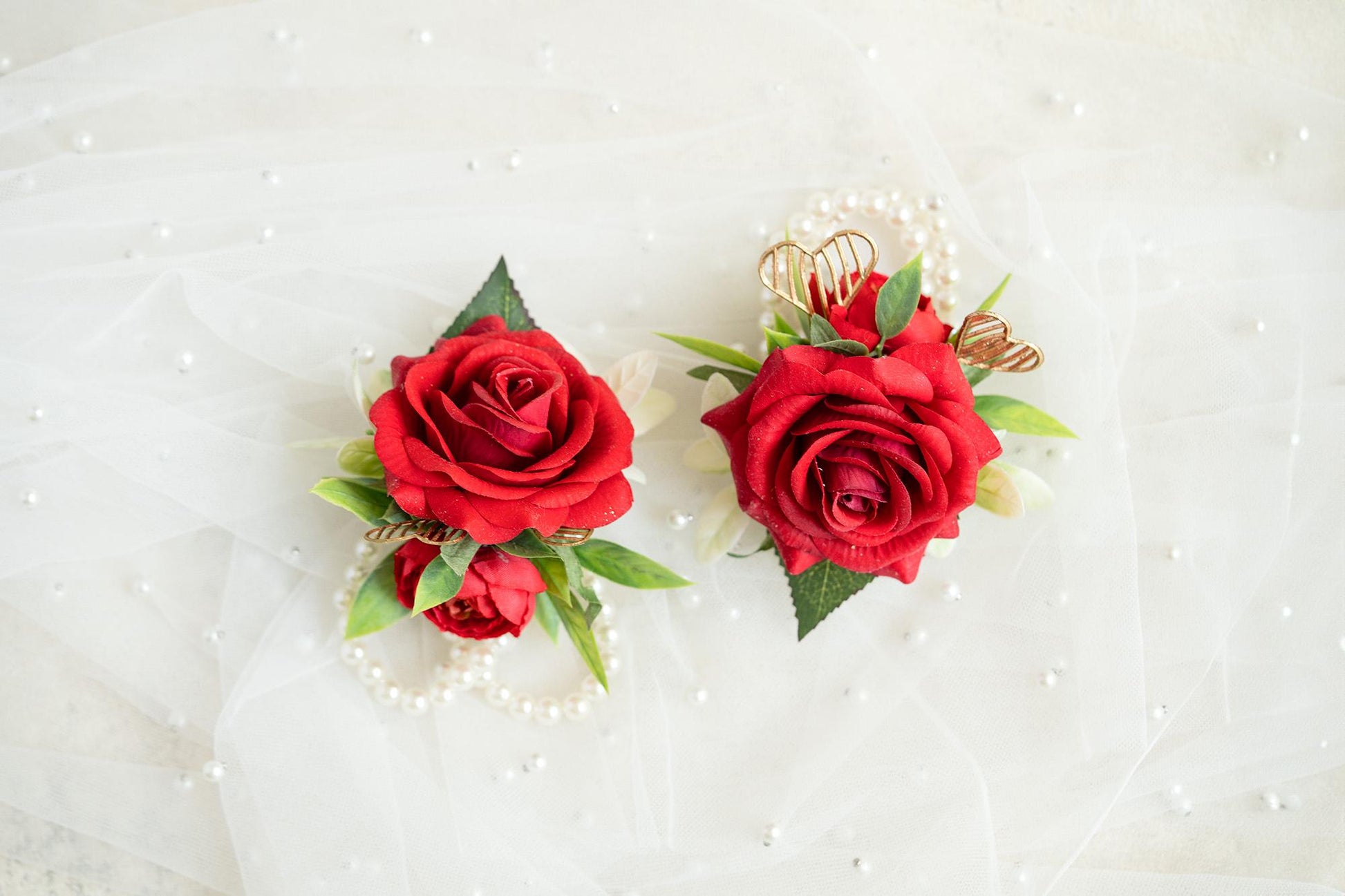 Red Silk Rose Prom Corsage with Gold Heart for Wedding, Flower Girl Wrist Pearl Bracelet, Bridesmaid Corsage Gift for Mom, Groom Boutonniere