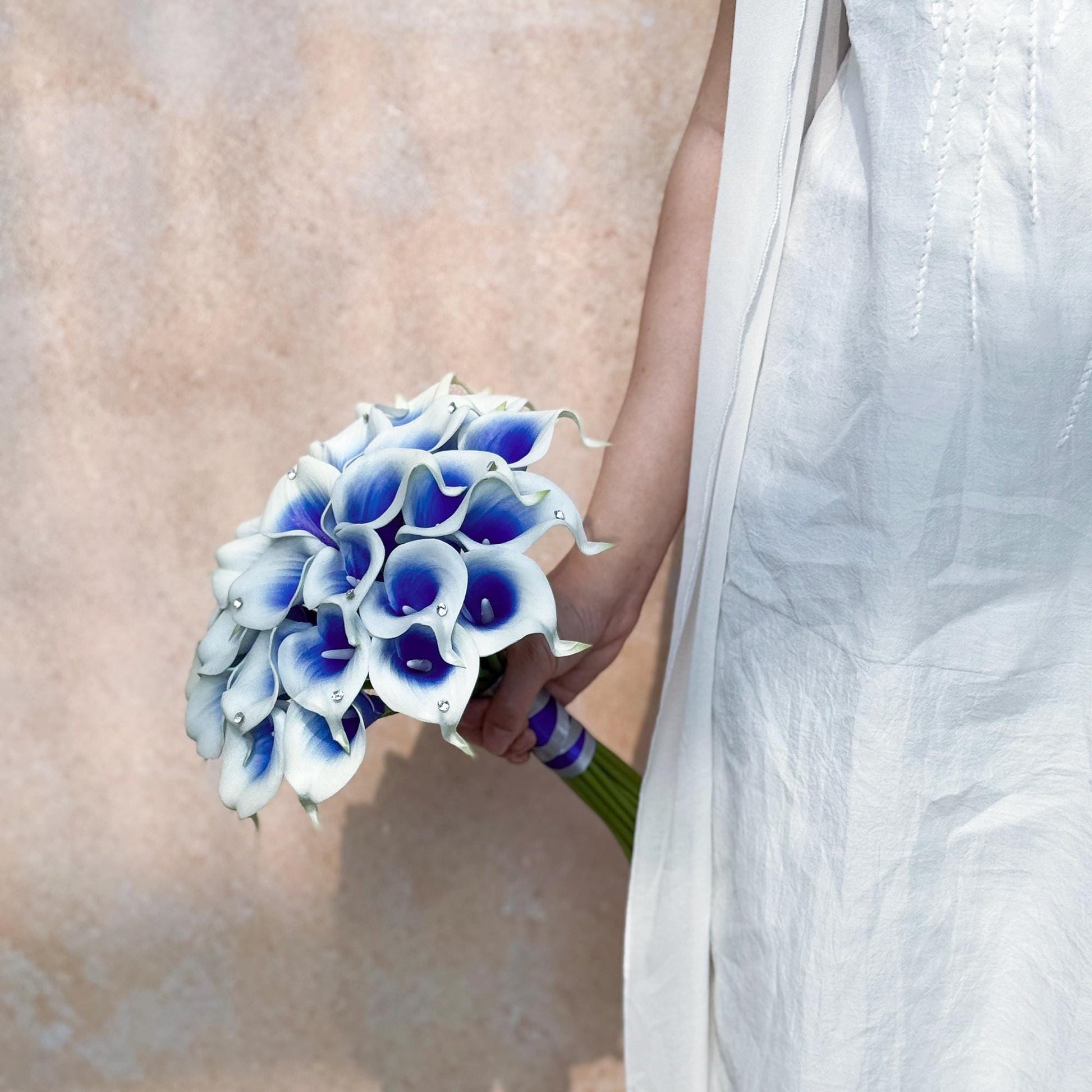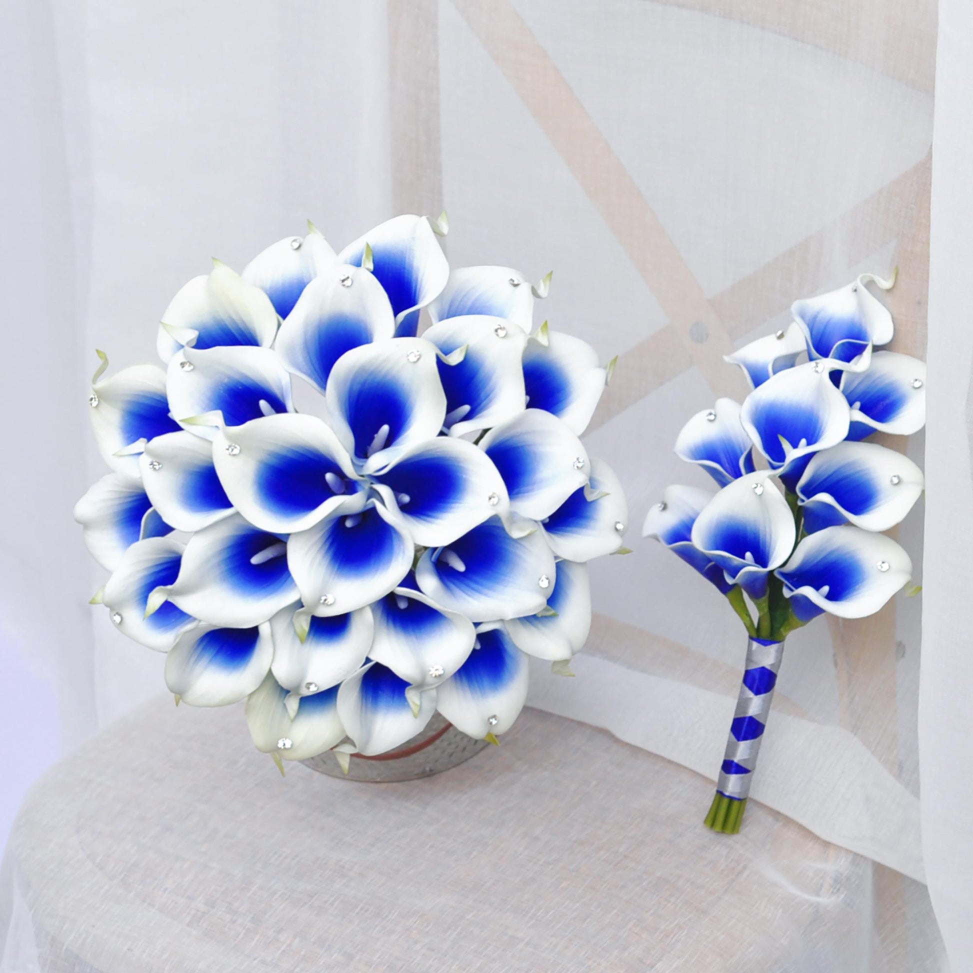 ❤This real touch round-shaped bouquet & fan style bridesmaid bouquet are made by royal blue & white calla lily flower and rhinestone.