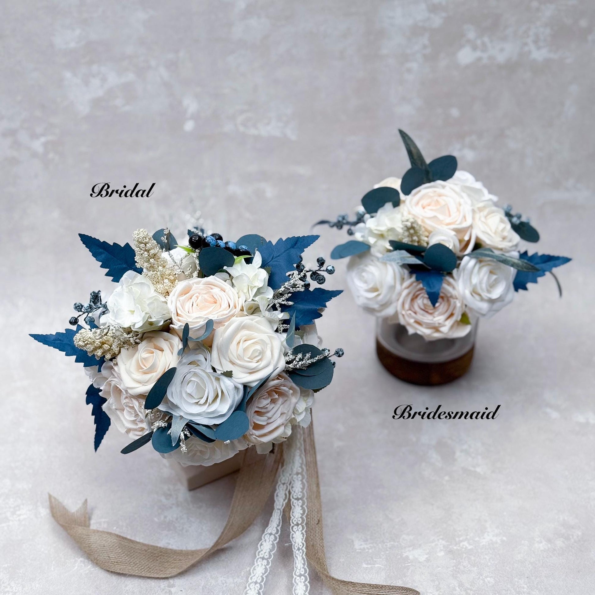 Rustic Cream Rose Bridal Bouquet, Champagne White Rose Bouquet, Grey Blue Bridesmaid Bouquet Gift For Her Wedding, Bridal Accessories
