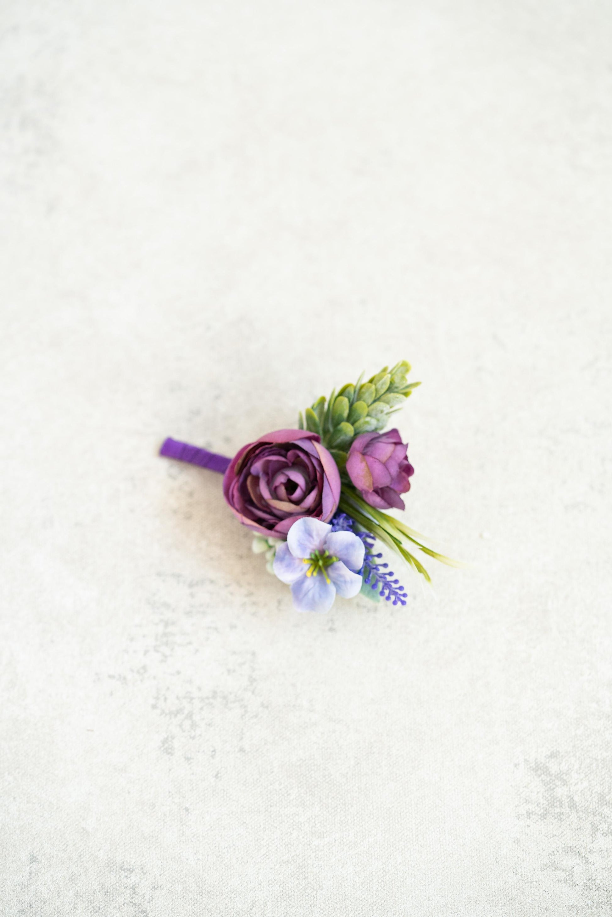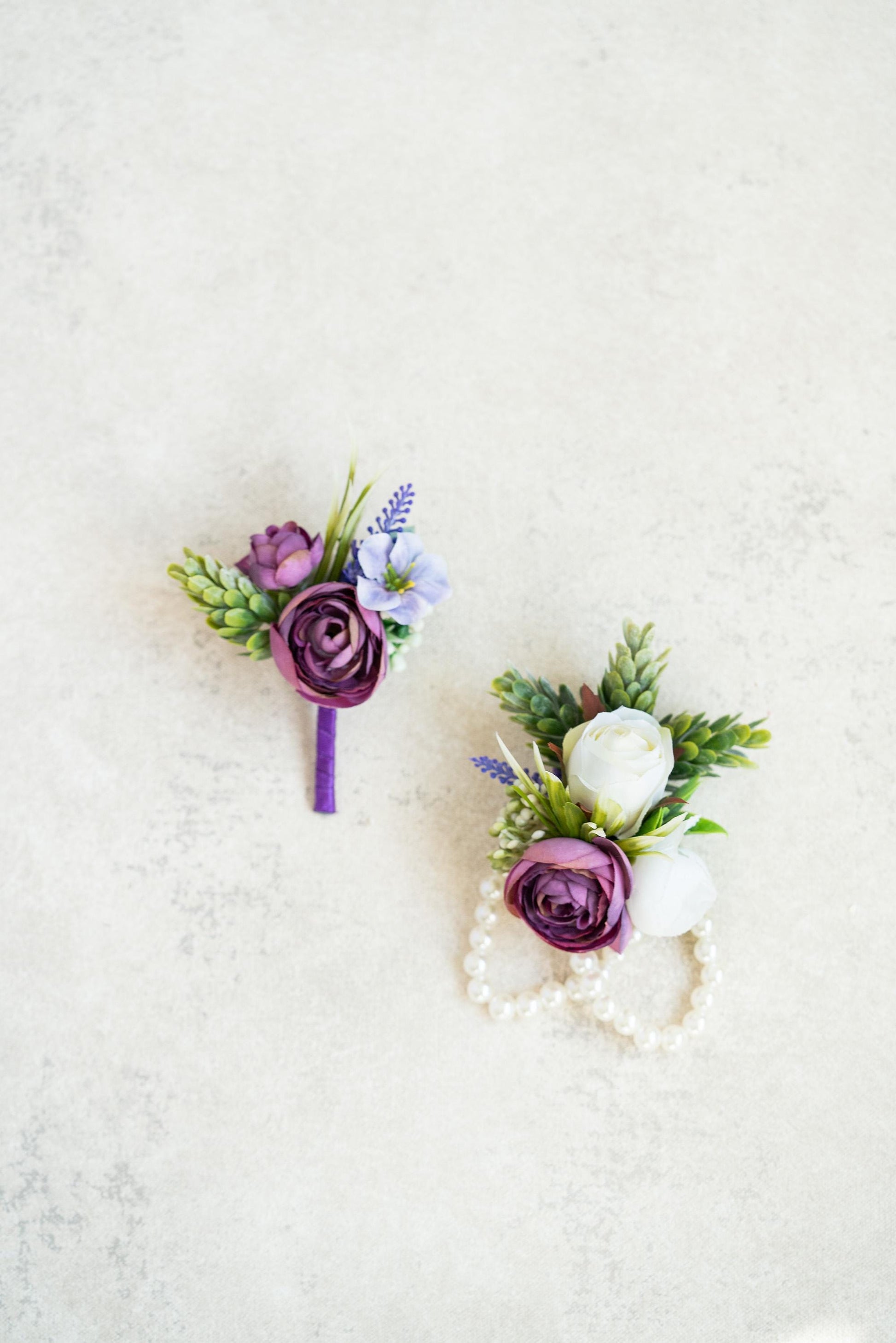 ❤ This royal purple corsage is crafted with purple rose flowers, accented with a touch of dusty green pine cone and plastic berry and some rustic foliage. The price includes either one corsage or one boutonniere.