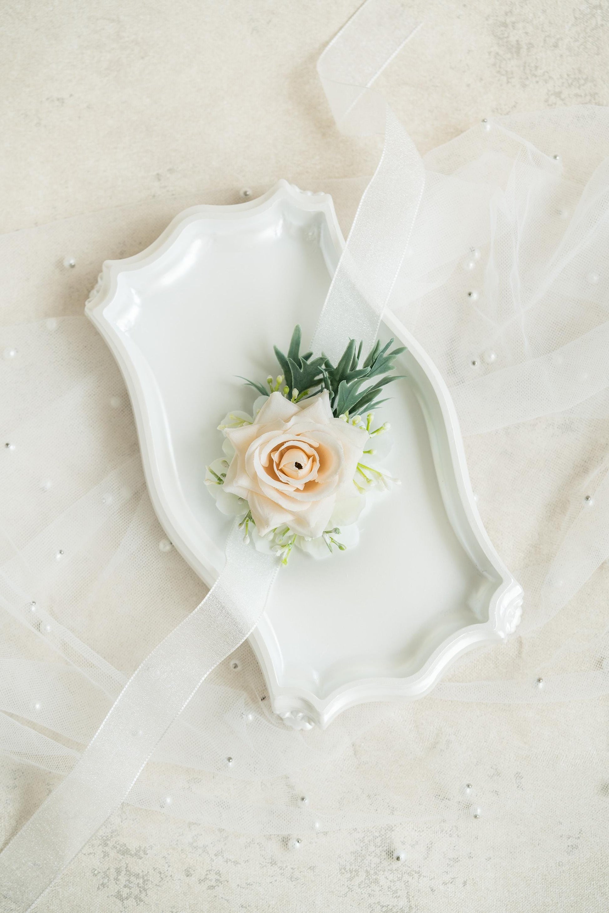 ❤This offwhite corsage is made with silk rose flowers and fern. The price includes one corsage or one boutonniere.