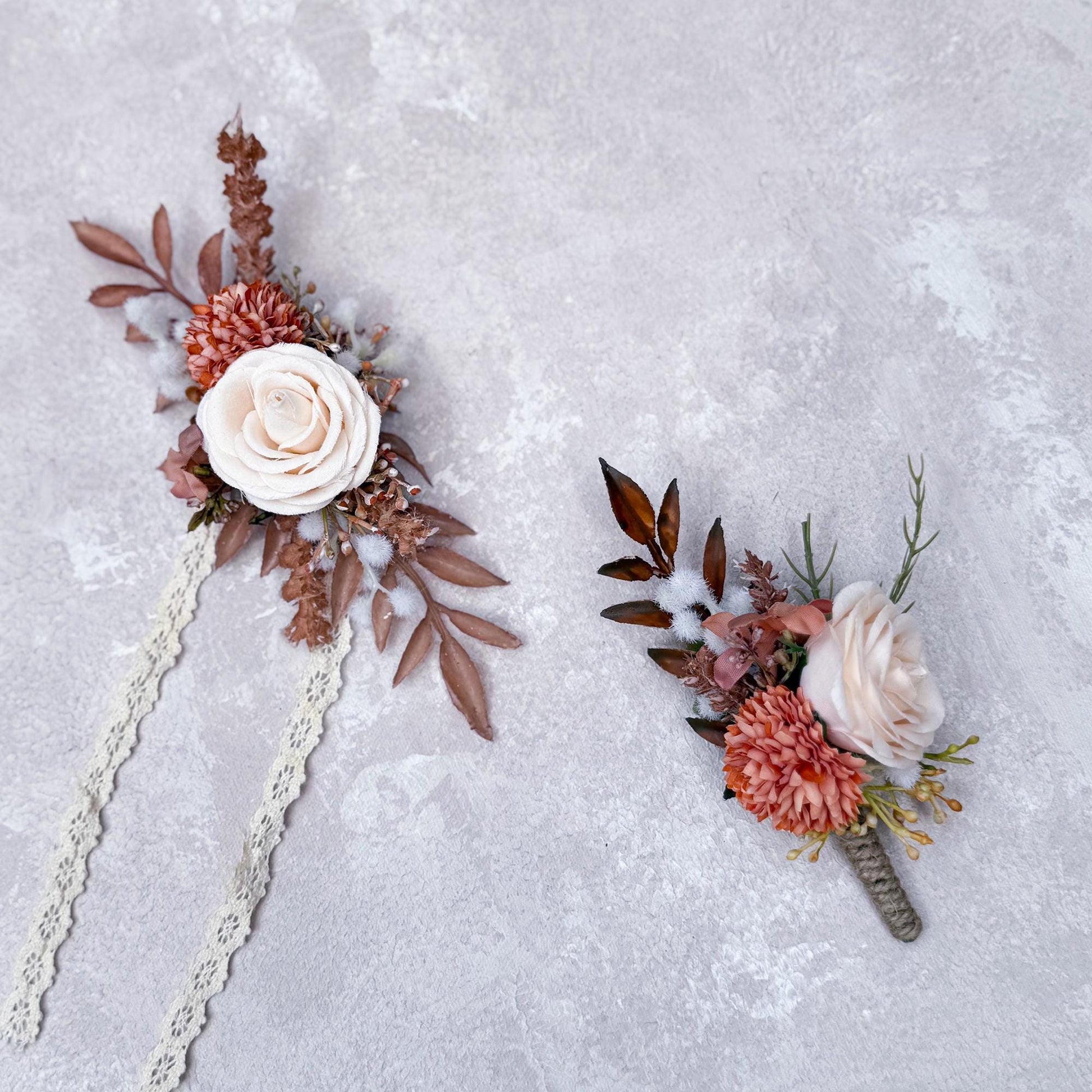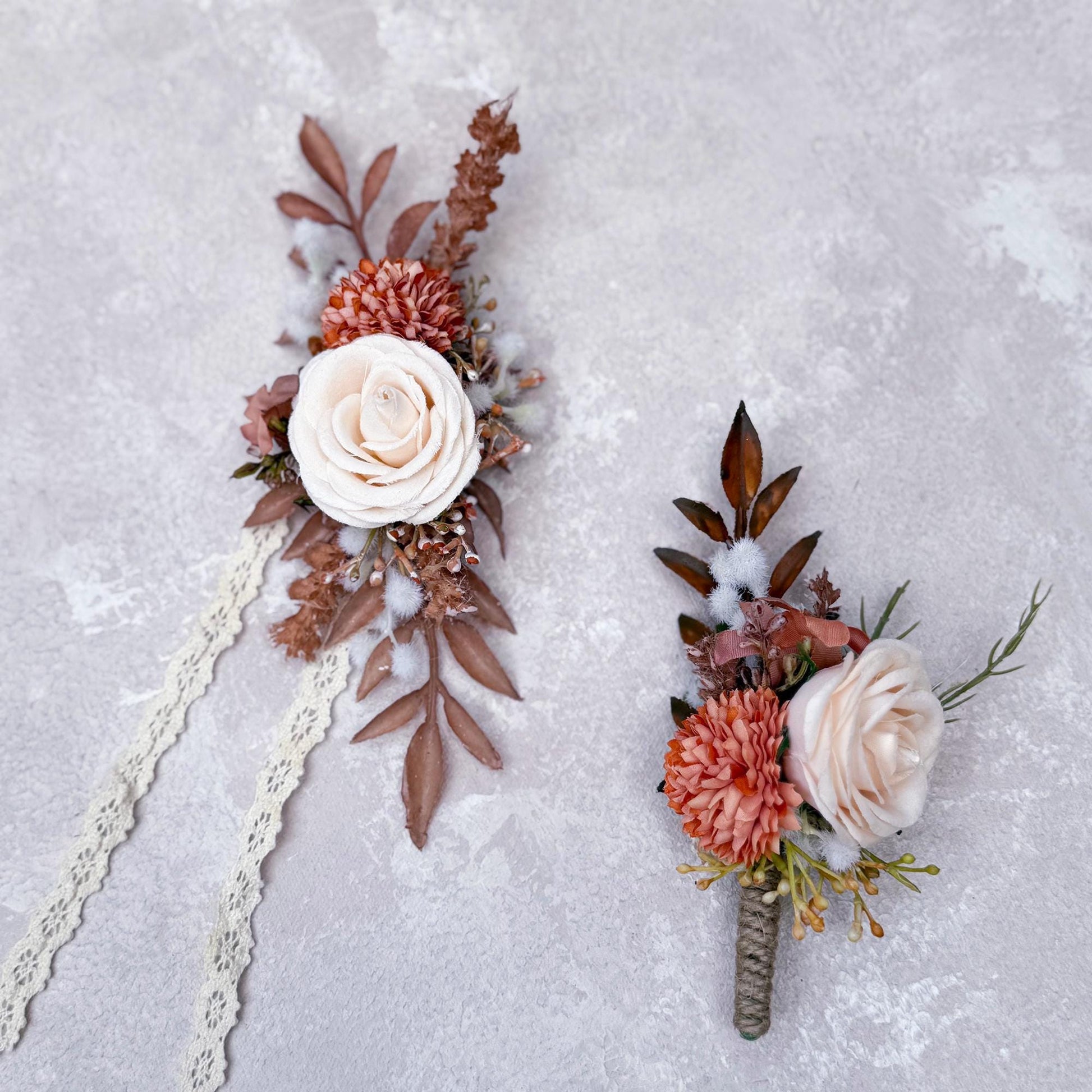 This wildflower bracelet / boutonniere is made with champagne white rose flowers and fall orange daisy and some fall foliage. The price includes one bracelet or one boutonniere.