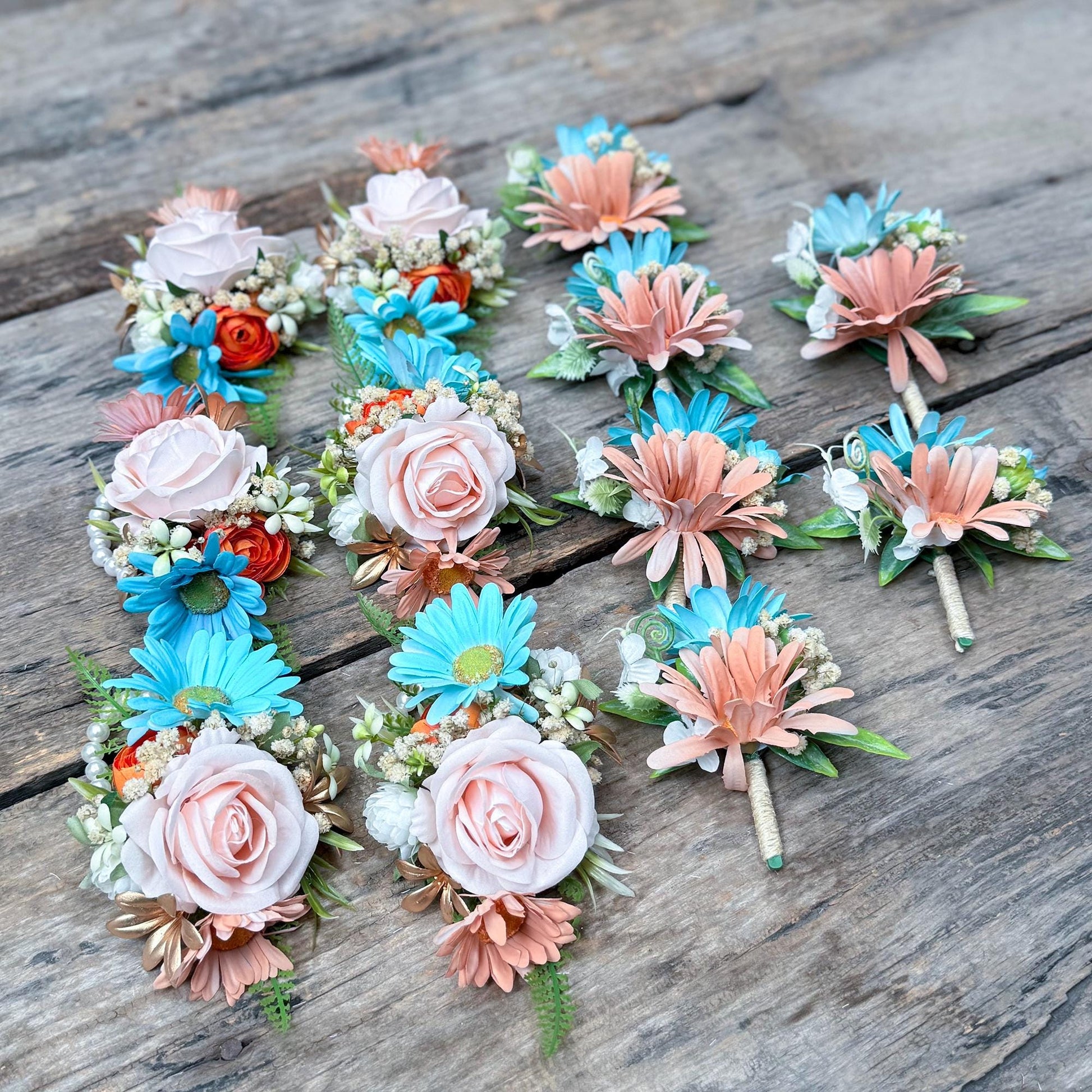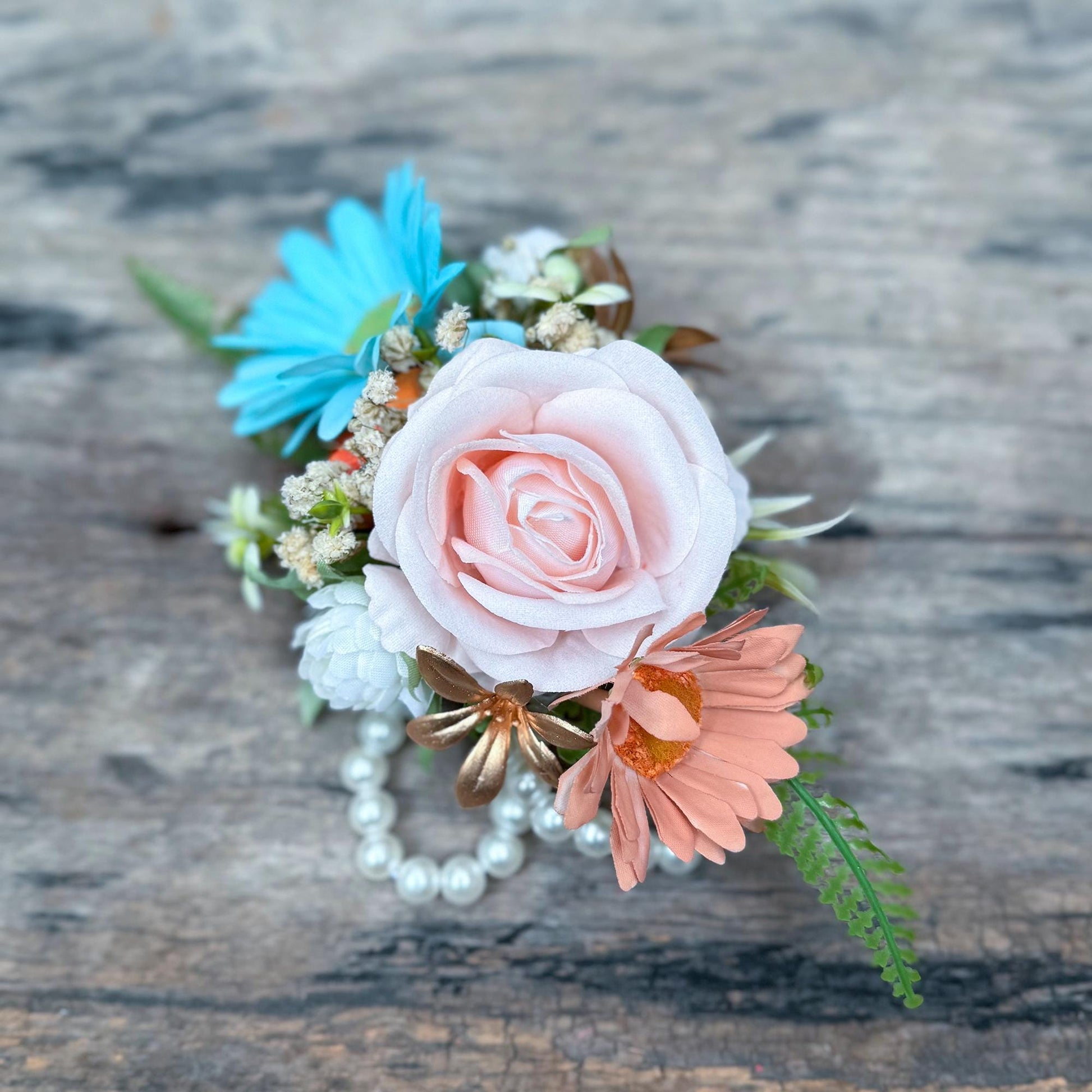 Tiffany Blue & Cappuccino Wrist Corsage – Silk Daisy Rose Baby’s Breath Bracelet – Boho Prom Corsage – Wedding Wristlet – Gift for Her