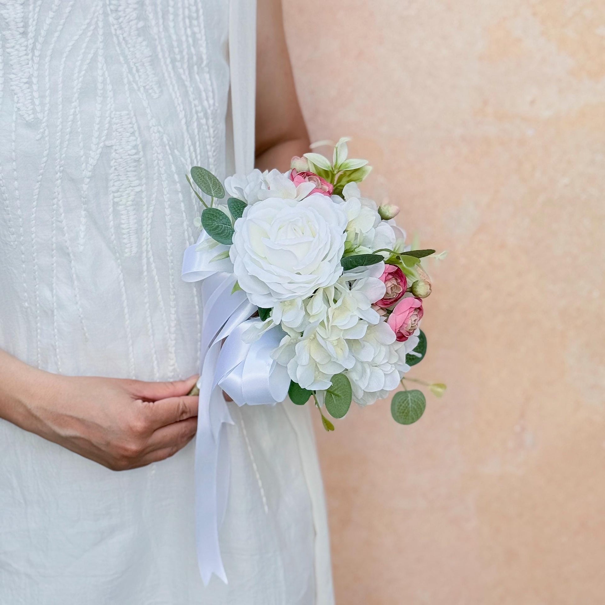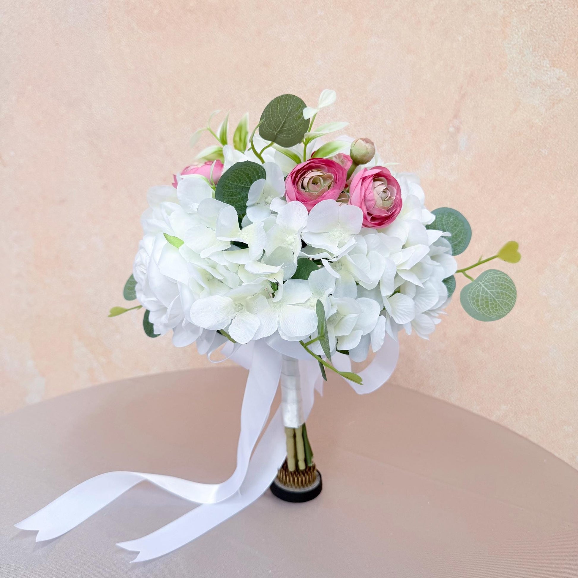 White Hydrangea & Pink Ranunculus Mini Bouquet: Silk Peony Wedding Flowers, Prom Gift